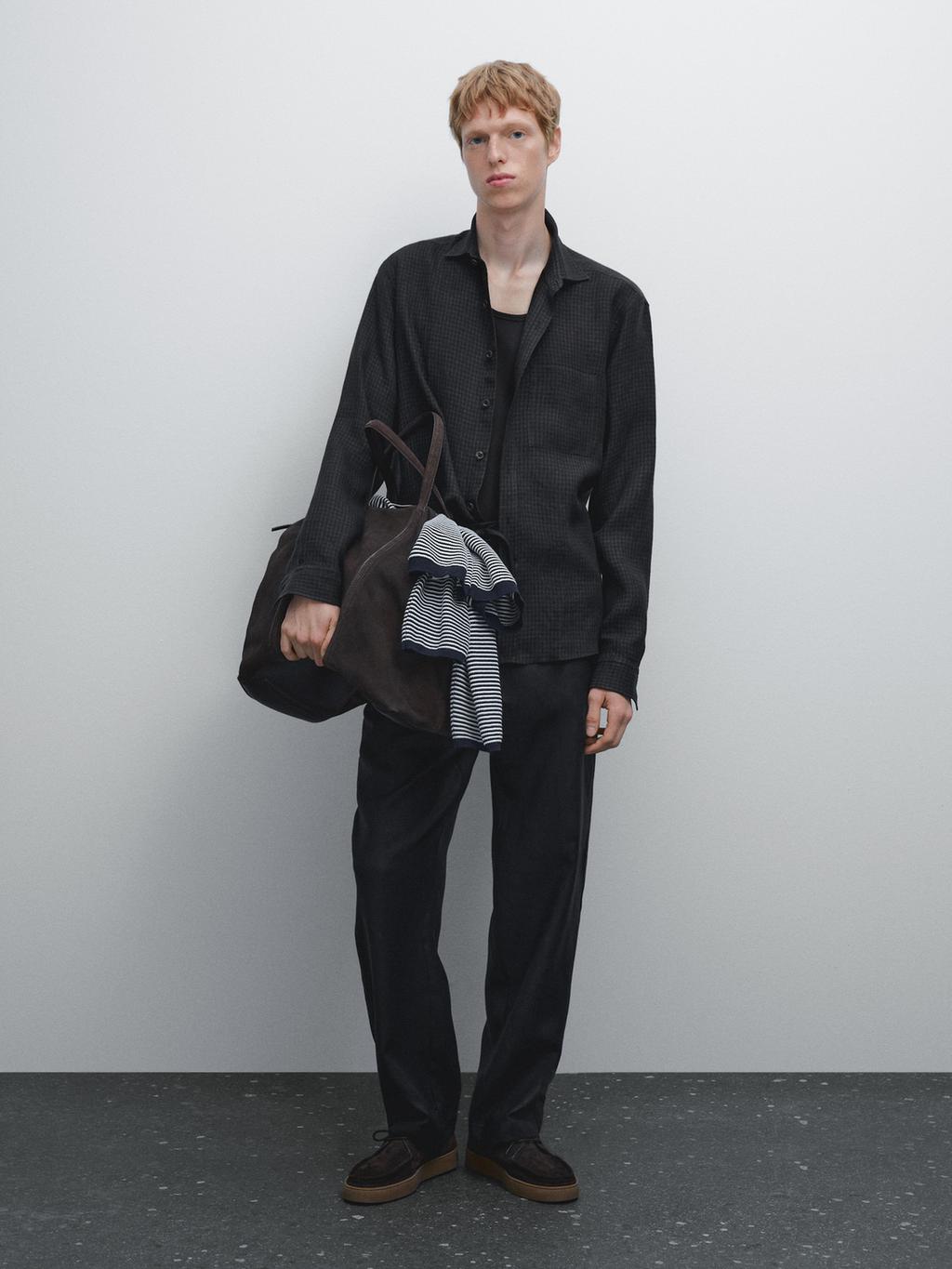 Trousers with a wide and relaxed silhouette, not tailored. Adjustable drawstring waist. Two side pockets. Back welt pocket. Fine, lightweight fabric.