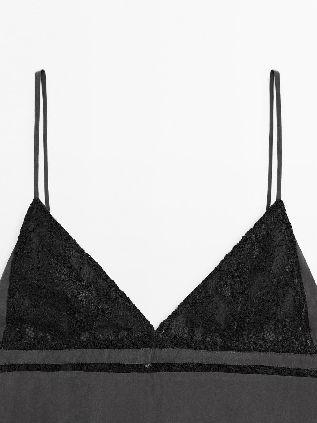 Midi dress made of 100% silk fabric. V-neck . Adjustable straps. Lace detail.