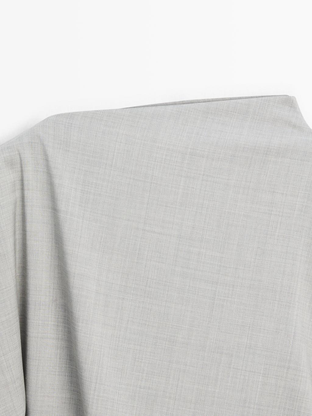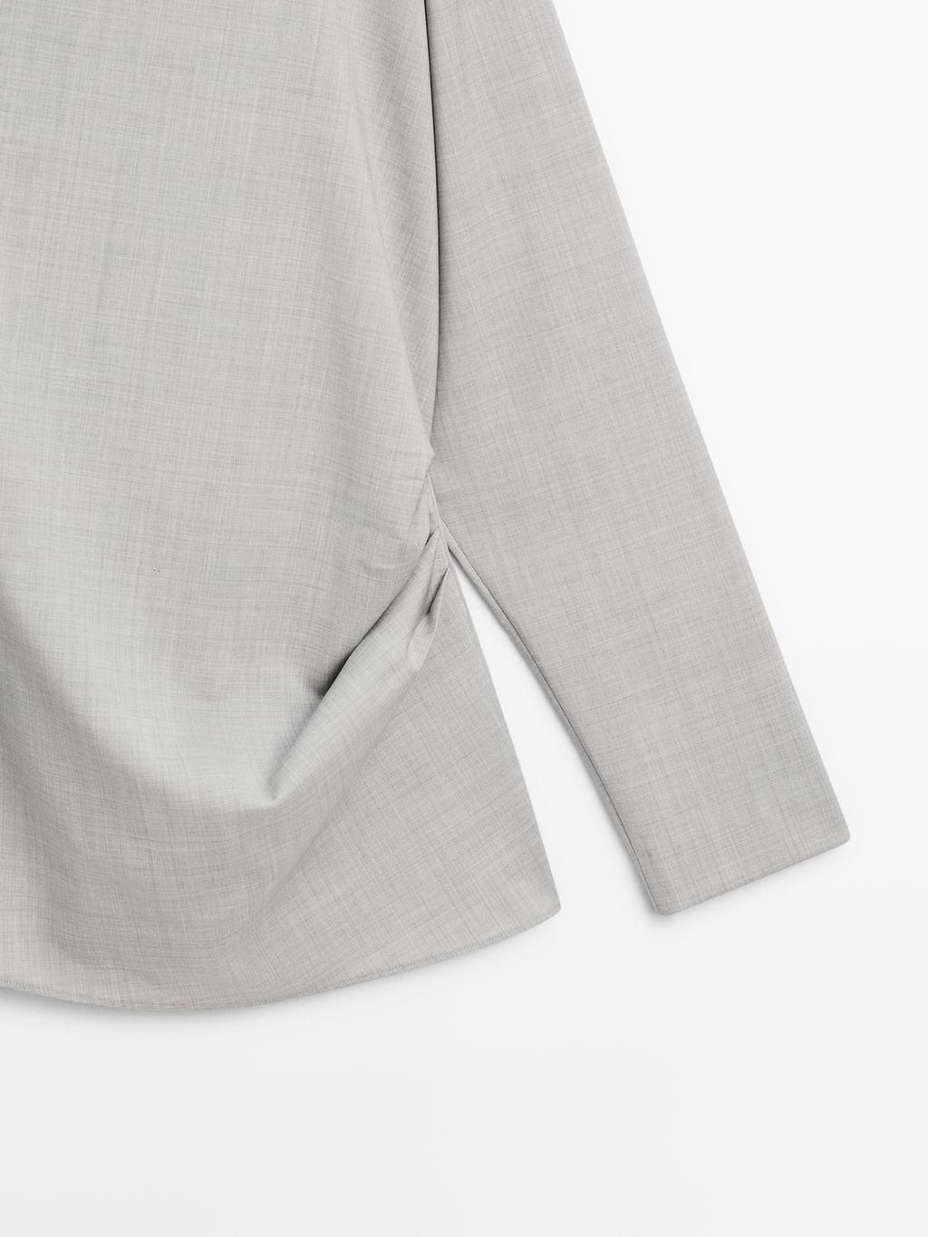Blouse made of 100% wool fabric . Draped collar. Draped waist detail. Asymmetric sleeve. Ruffled sleeve. Matching garment available.