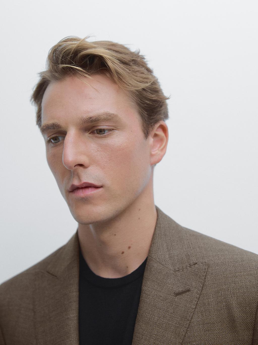 Blazer made of 100% wool. Notched lapel collar with buttonhole. Long sleeves with buttoned cuffs. Two-button fastening. Two flap pockets. Besom pocket at the chest. Two back vents.