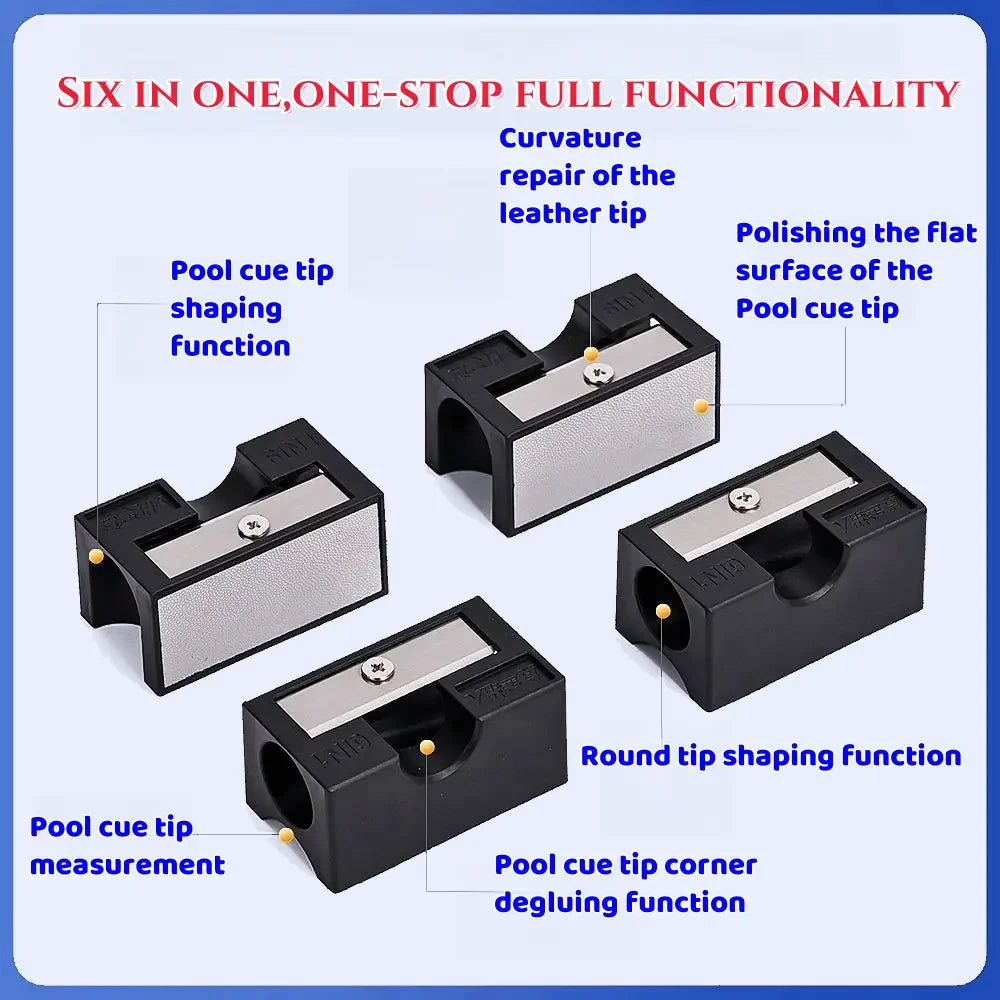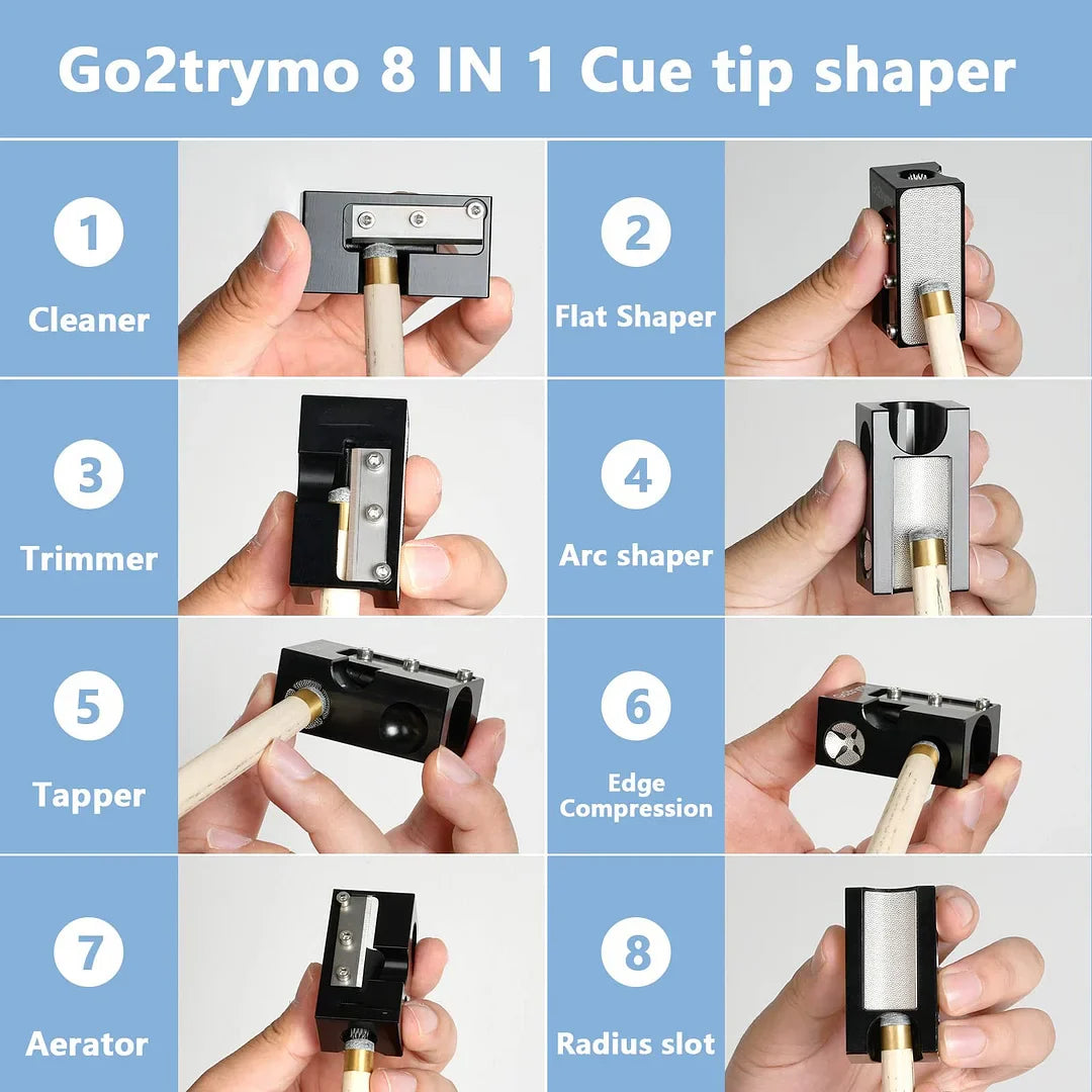 8-in-1 Pool Cue Tip Repair Tool: Professional billiard Cue tip shaper is specially designed to replace pool cue tips, and help you to clean the ferrule, shape/tape/trim/scuff/press/shape the tip to a dime all from this one tool.