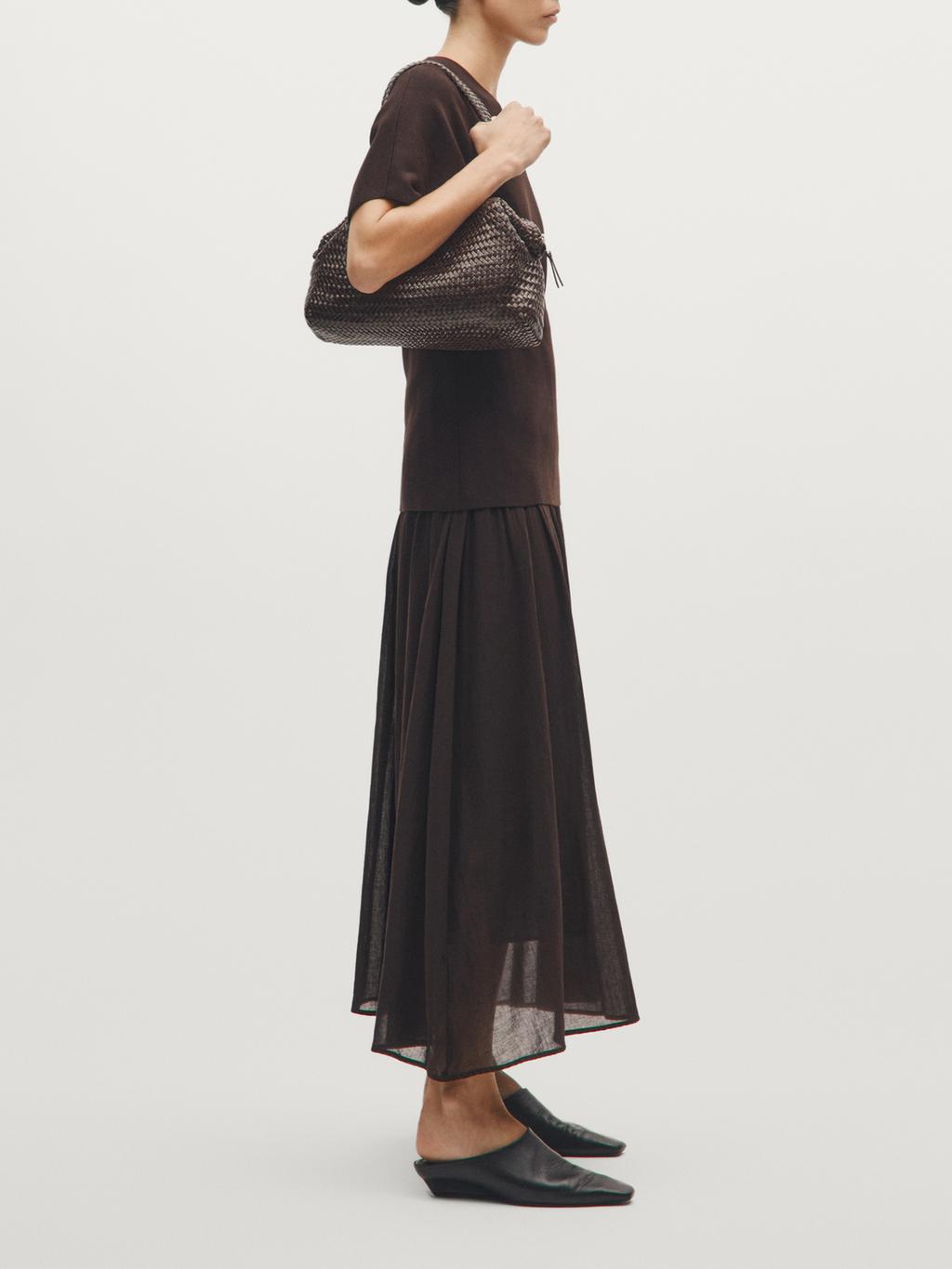 Handbag made of cowhide leather with a nappa finish. A handle/shoulder strap. Zip fastening. Cotton lining. Braided detail.