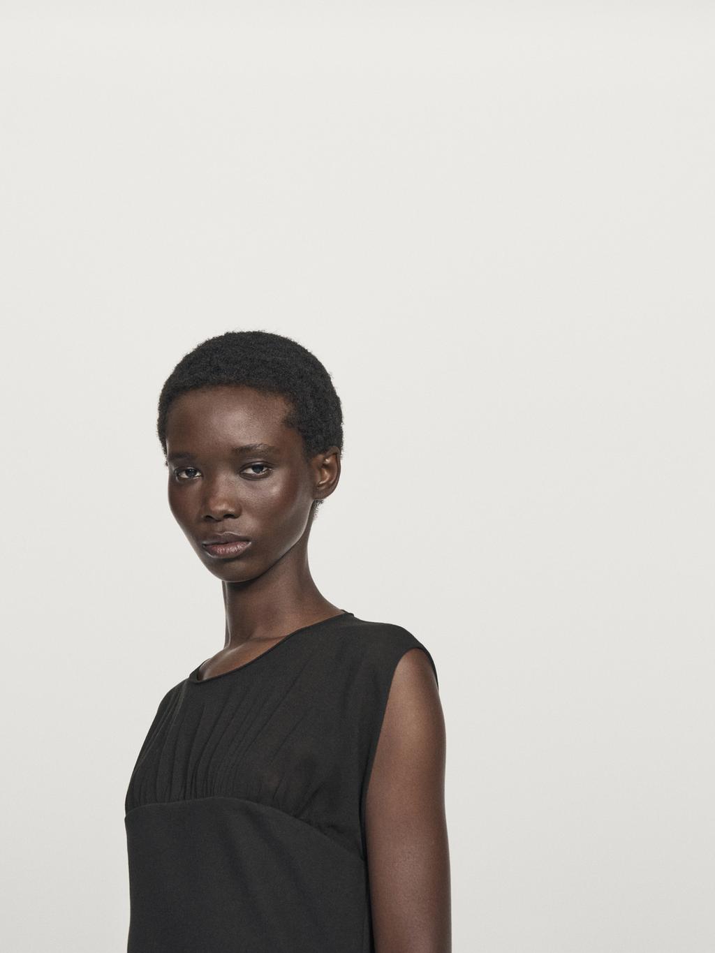 Midi-cut dress. Crew neck. Sleeveless. Back button fastening and teardrop opening. Zip fastening at the back. Overlay detail. Semi-sheer fabric in the chest area.