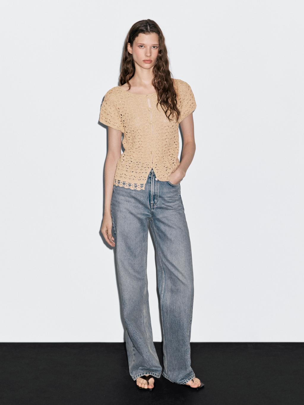 Knit cardigan made of a cotton blend. Boat neck. Short sleeves. Button-up front. Openwork fabric . Crochet fabric.