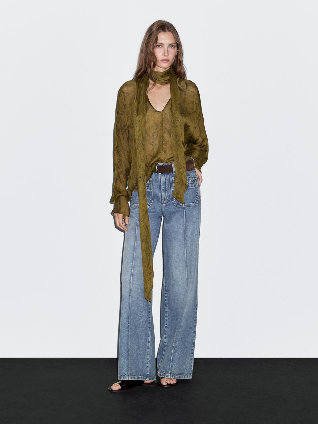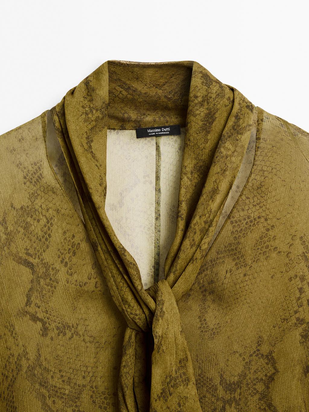 Flowing blouse with long sleeves. V-neck. Collar with multiway shawl-style tie detail. Snakeskin print. Semi-sheer fabric.