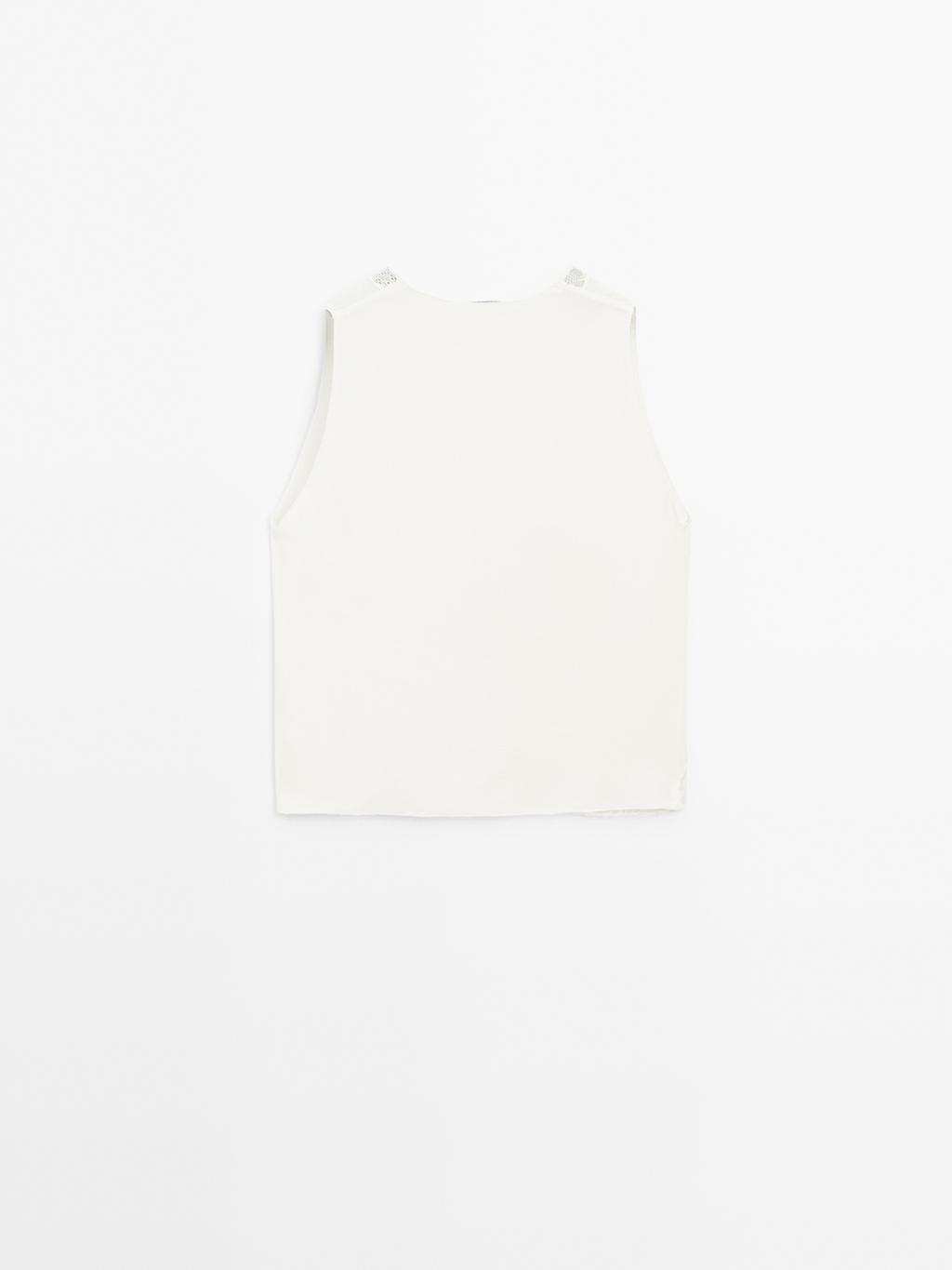 Flowing blouse. V-neck . Sleeveless. Button and press stud fastening. Lace detail.