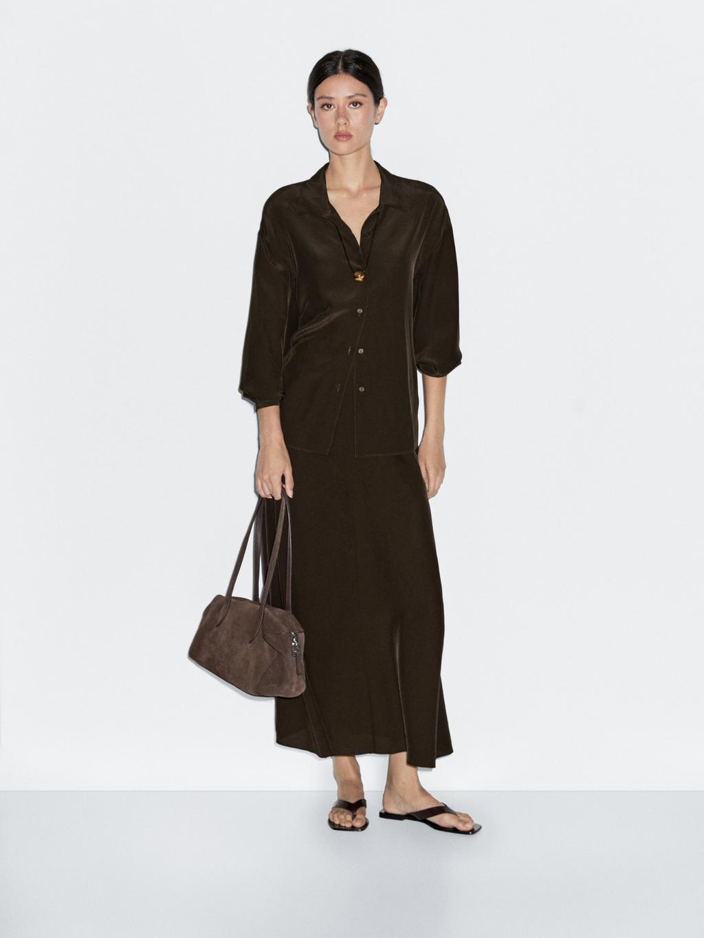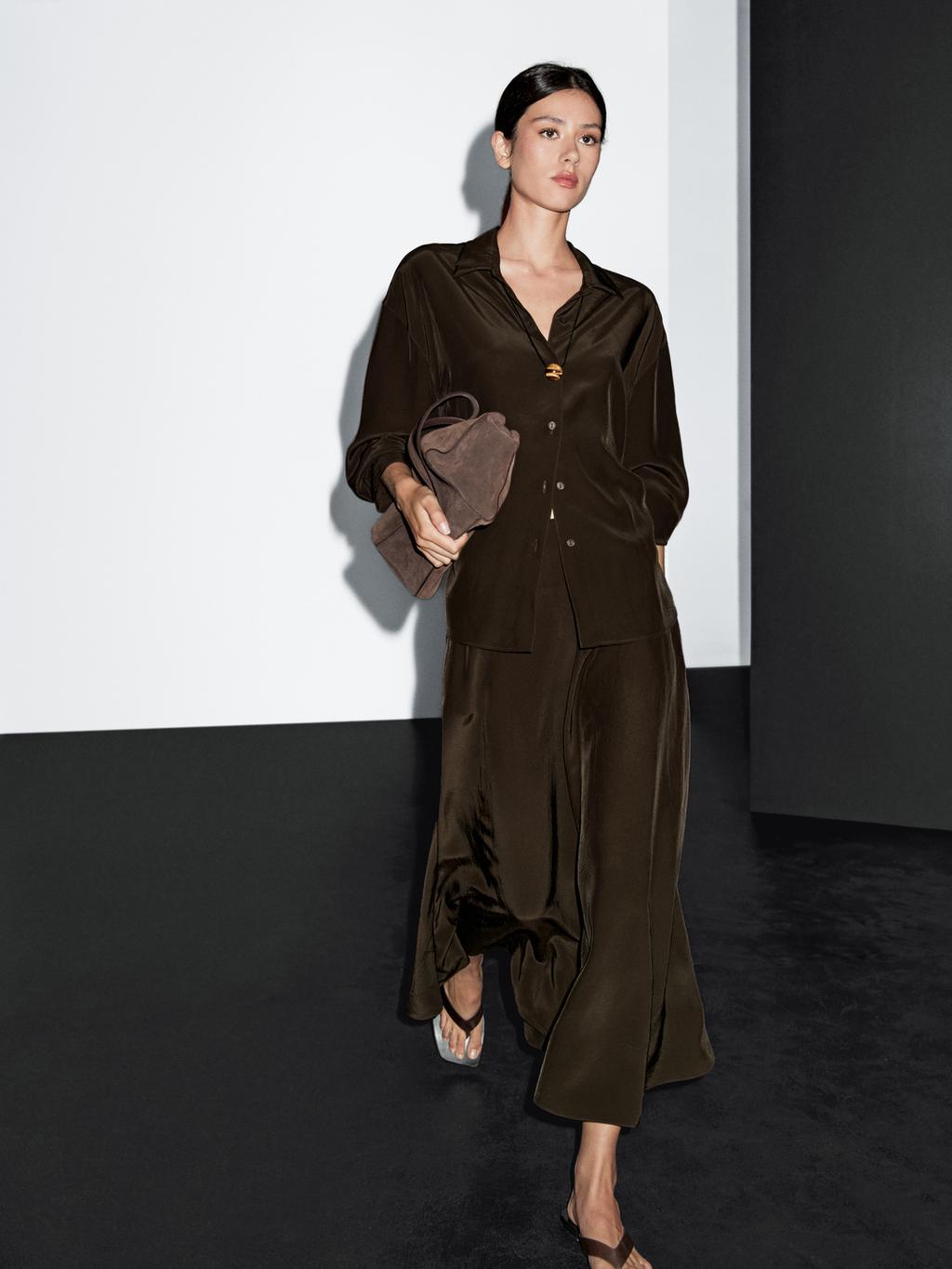 Long flared skirt. Zip fastening at the back. Central seam detail . Fine, lightweight fabric.