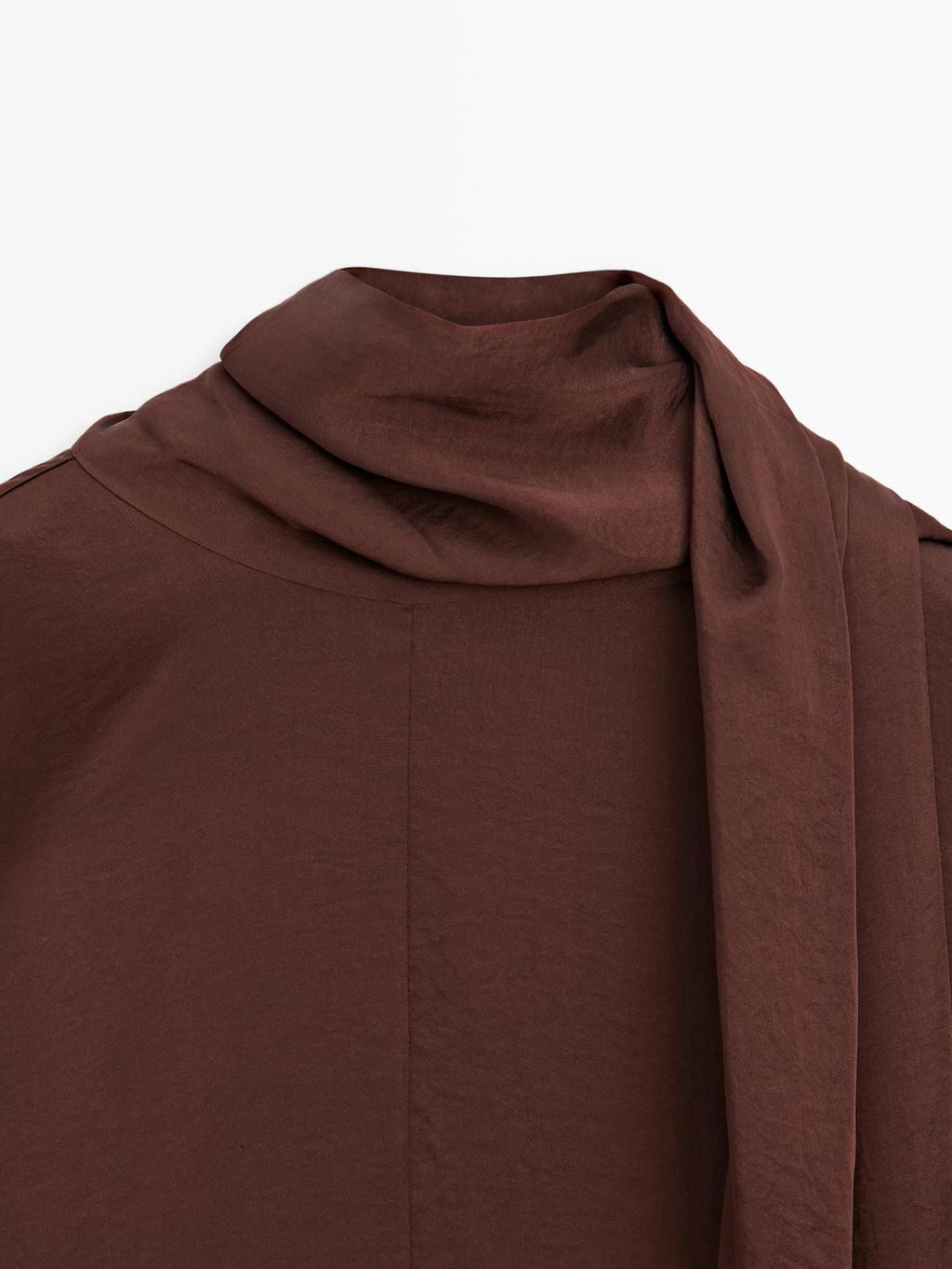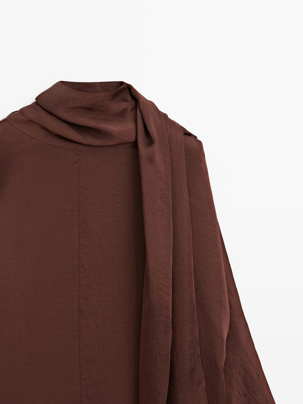 Midi dress in flowing fabric with satin finish. Batwing sleeves. Collar with multiway shawl-style tie detail. Central back opening.