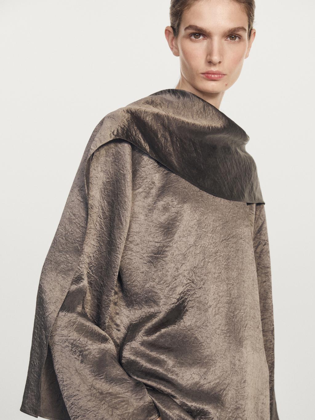 Flowing voluminous blouse with a wraparound collar. Long sleeves. Satin finish. Wrinkled effect finish.