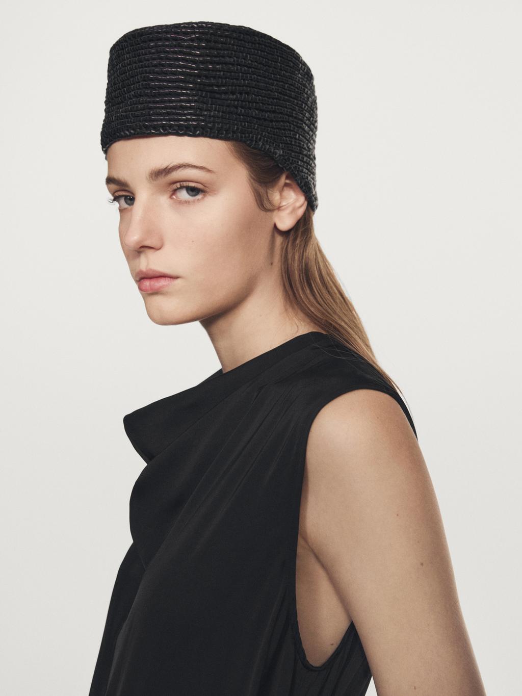 Jumpsuit made of flowing satin finish fabric . Draped collar. Sleeveless. Zip fastening at the back. Two side pockets. Includes belt.