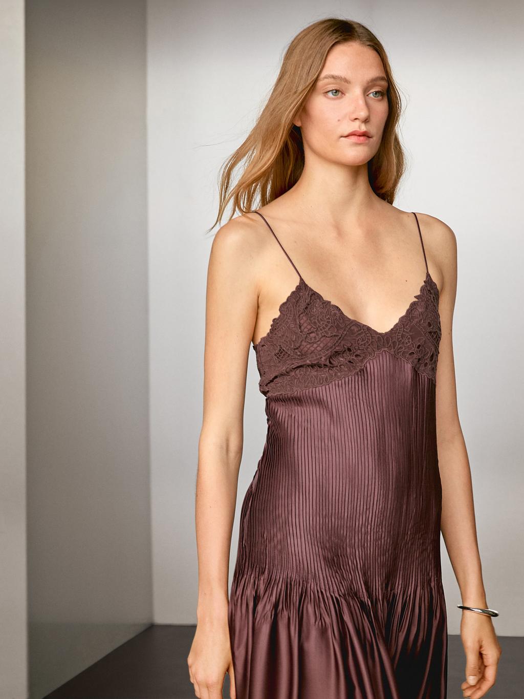 Midi dress in flowing fabric with satin finish. Strappy. Side zip fastening. Decorative embroidery. Lined. Pintuck detail.