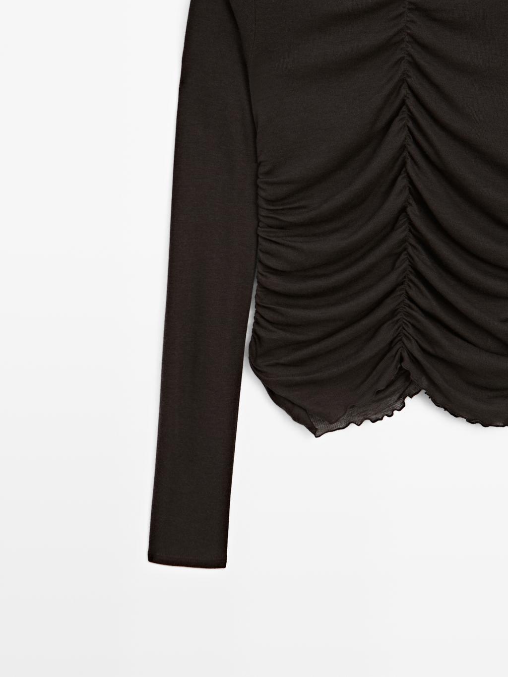 T-shirt made from lyocell wool fabric. V-neck . Long sleeves. Wavy trim detail. Gathered detail. Fine, lightweight fabric.