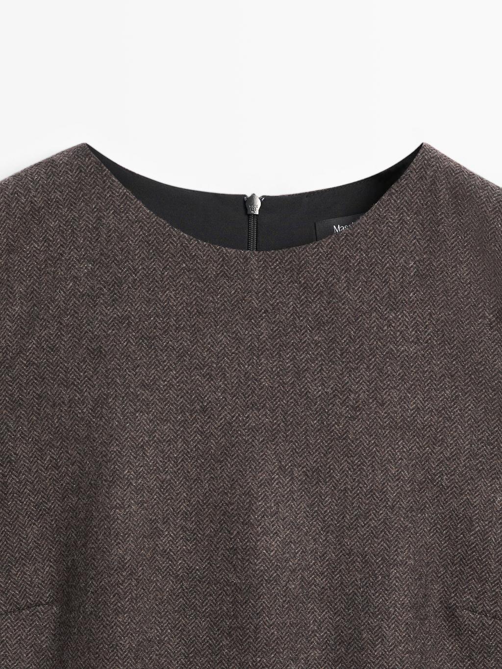 Short dress made of wool blend fabric . Crew neck. Sleeveless. Zip fastening at the back. Two side pockets. Central back opening. Herringbone fabric.