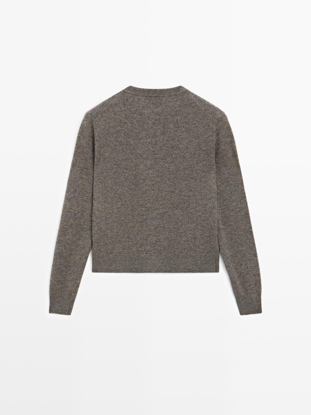 100% wool knit cardigan. Crew neck. Long sleeves. Button-up front. Ribbed trims .