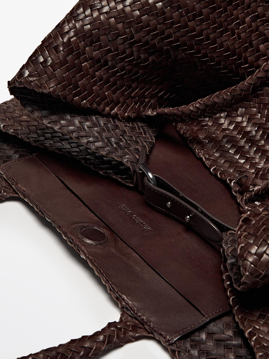 Tote bag made of bovine leather with a nappa finish. Magnetic snap-button fastening. Two handles and/or shoulder strap. Main compartment. Braided detail.