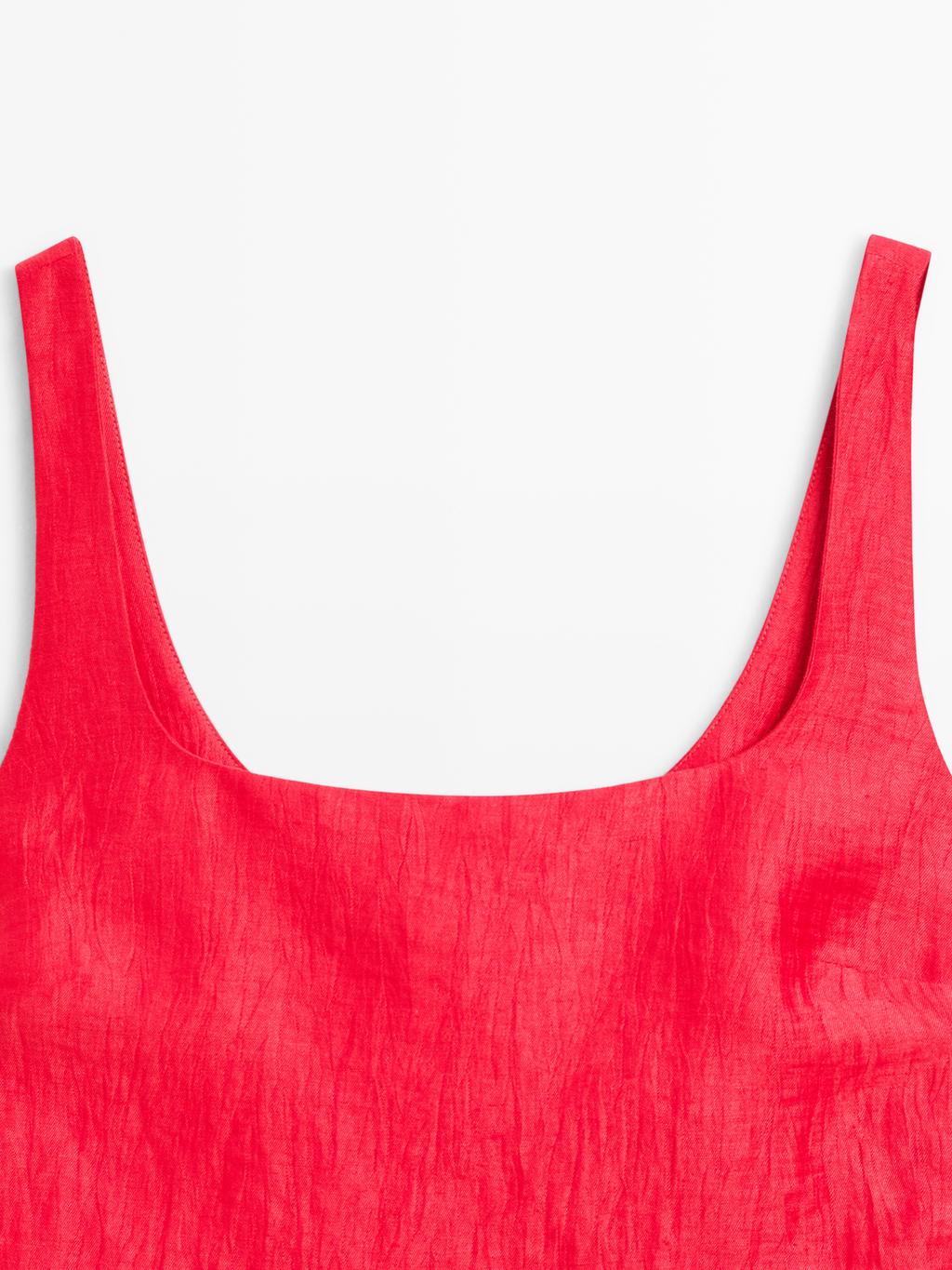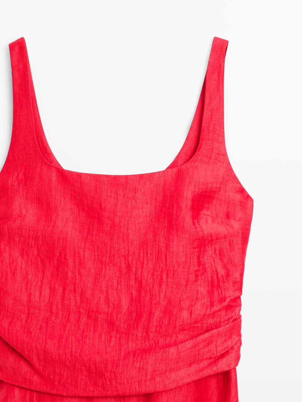 Midi dress made of linen blend fabric with a round neckline. Straps. Front opening. Side zip fastening. Wrinkled effect finish. Gathered detail.