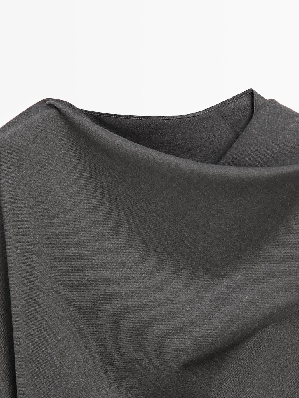 Long dress made of 100% wool fabric . Draped collar. Sleeveless. Side split hem. Ruffled detail. Gathered detail on the sides .