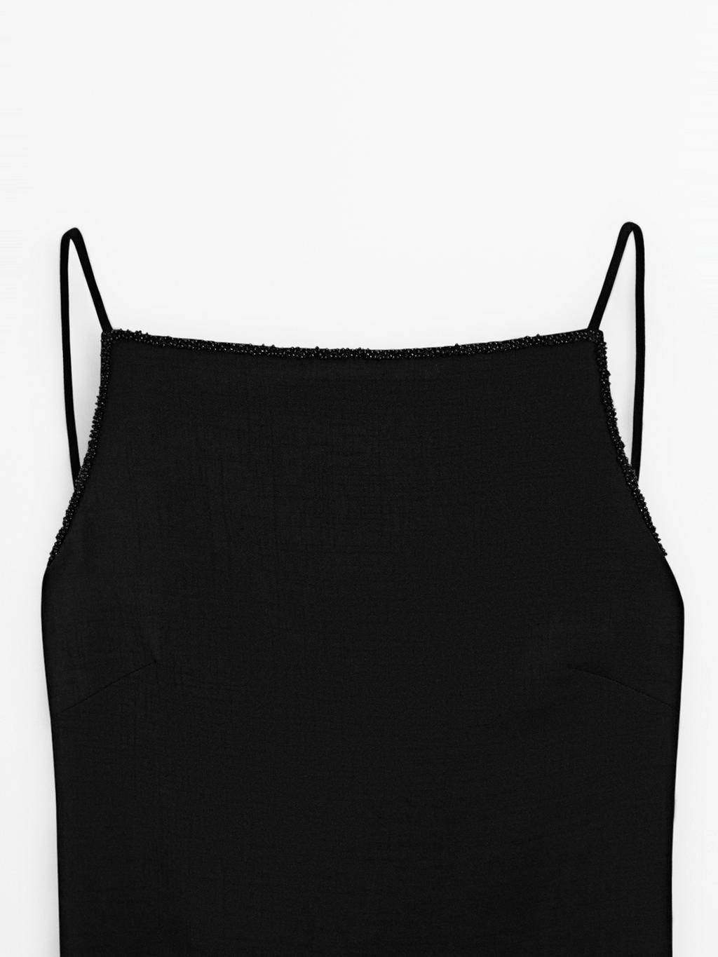 Long flared dress. Neckline detail at the back . Strappy. Fabric detail with rhinestones . Side zip fastening. Hem with back vent. Lined.