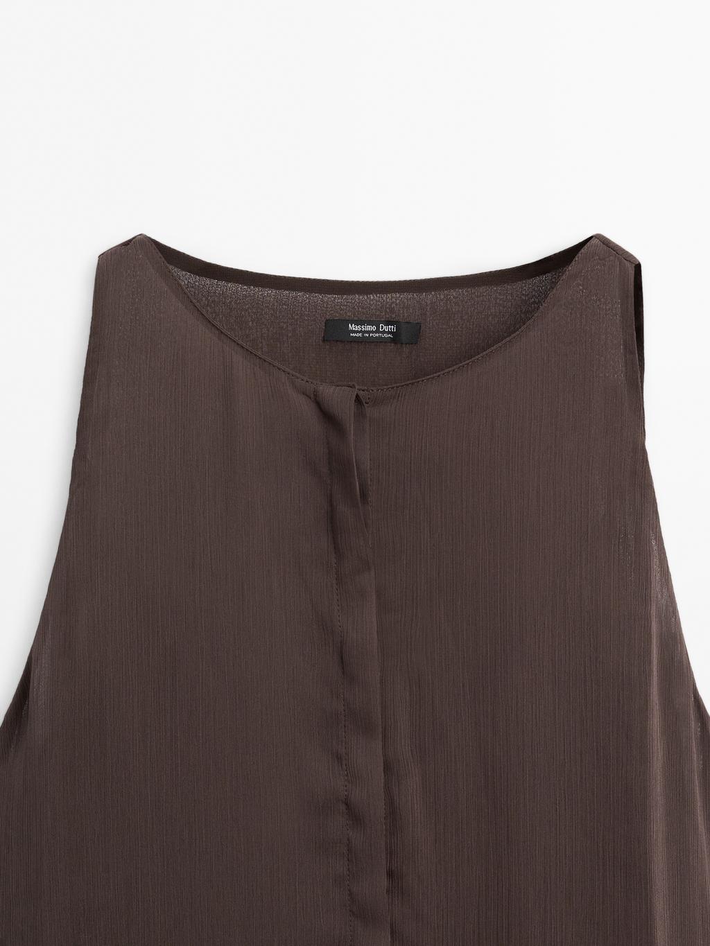 Long flowing dress with round neckline . Sleeveless. Front button fastening concealed by a placket. Ruffled detail. Semi-sheer fabric.