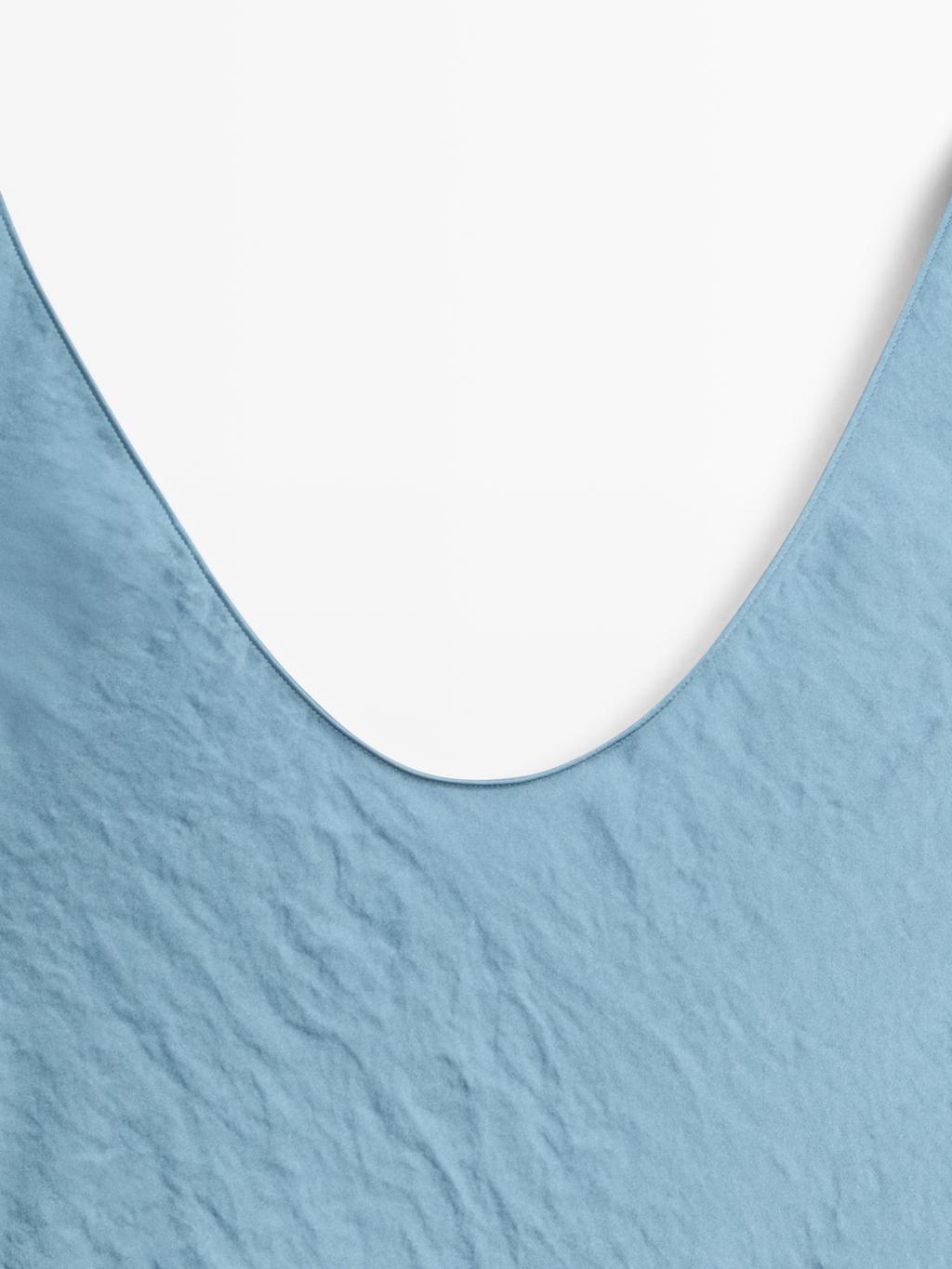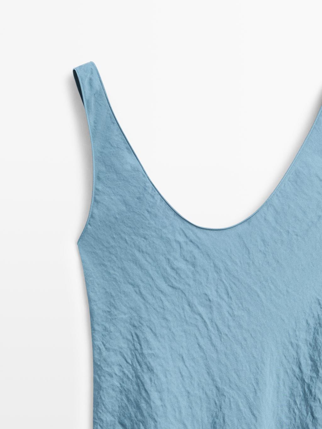 Long dress made of flowing fabric with a satin finish. Round front and back neckline. Straps.