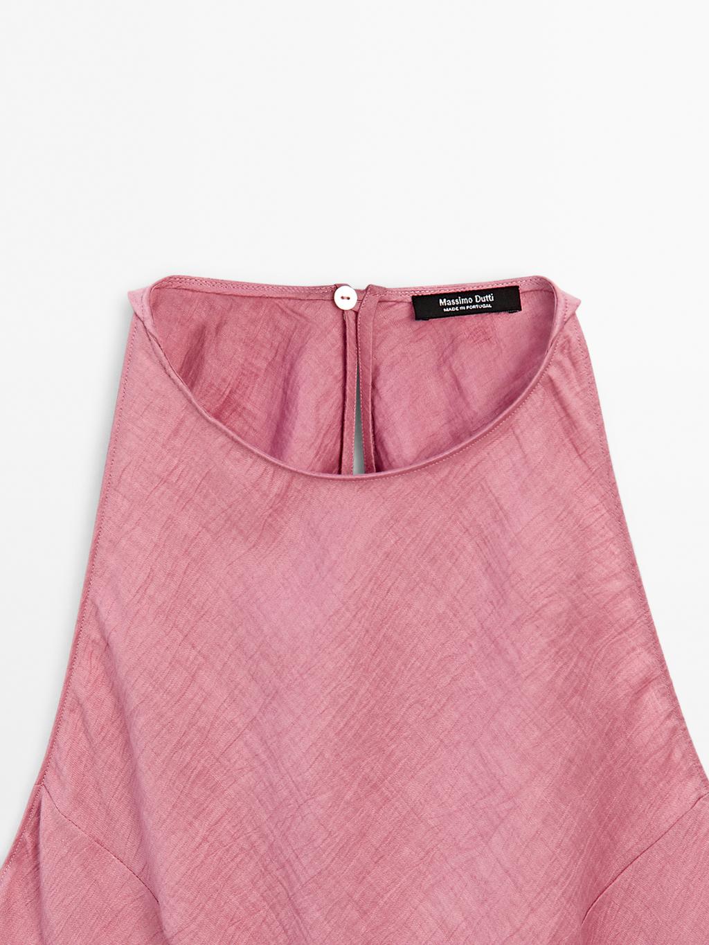 Long dress made of linen-blend fabric. Halter neck. Back button fastening and teardrop opening.
