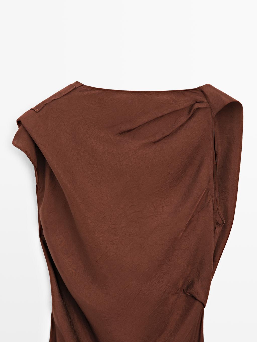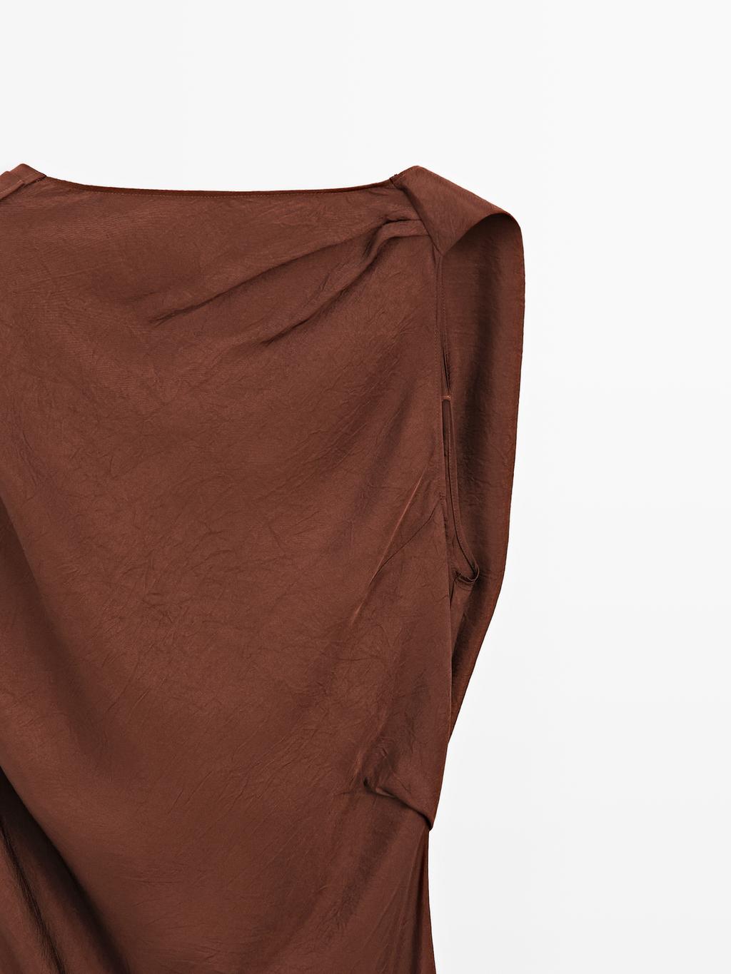 Long flowing dress with round neckline . Sleeveless. Satin finish. Draped detail. Open back detail.