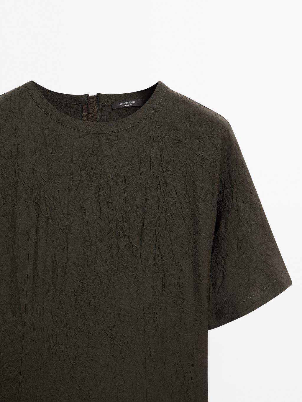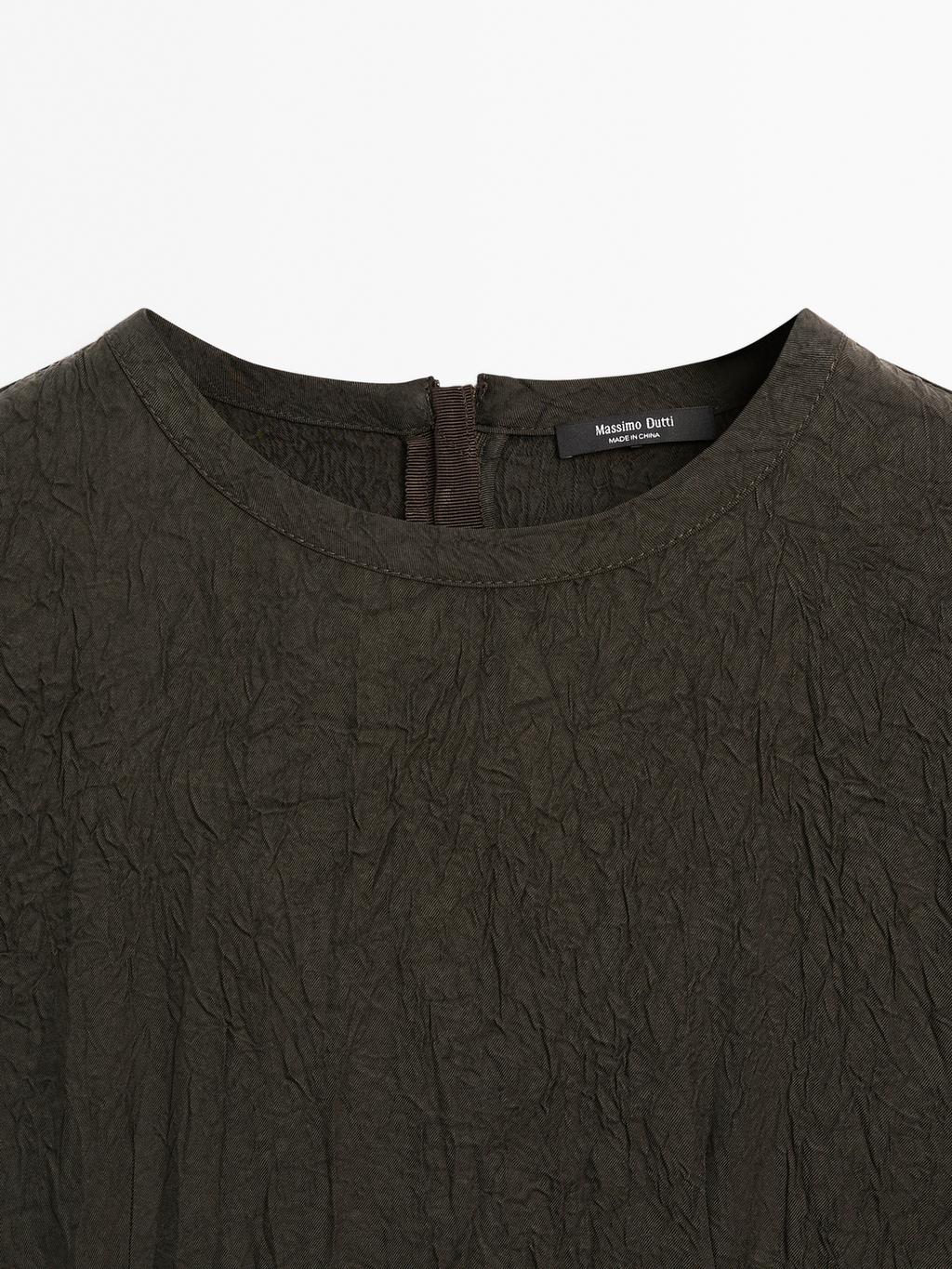 Long dress made of flowing fabric with a satin finish. Short batwing sleeve. Crew neck. Zip fastening at the back. Seam details . Wrinkled effect finish.