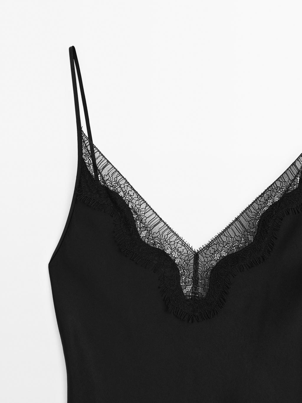 Long V-neck dress. Strappy. Lace trim detail . Flowing fabric with a satin finish.