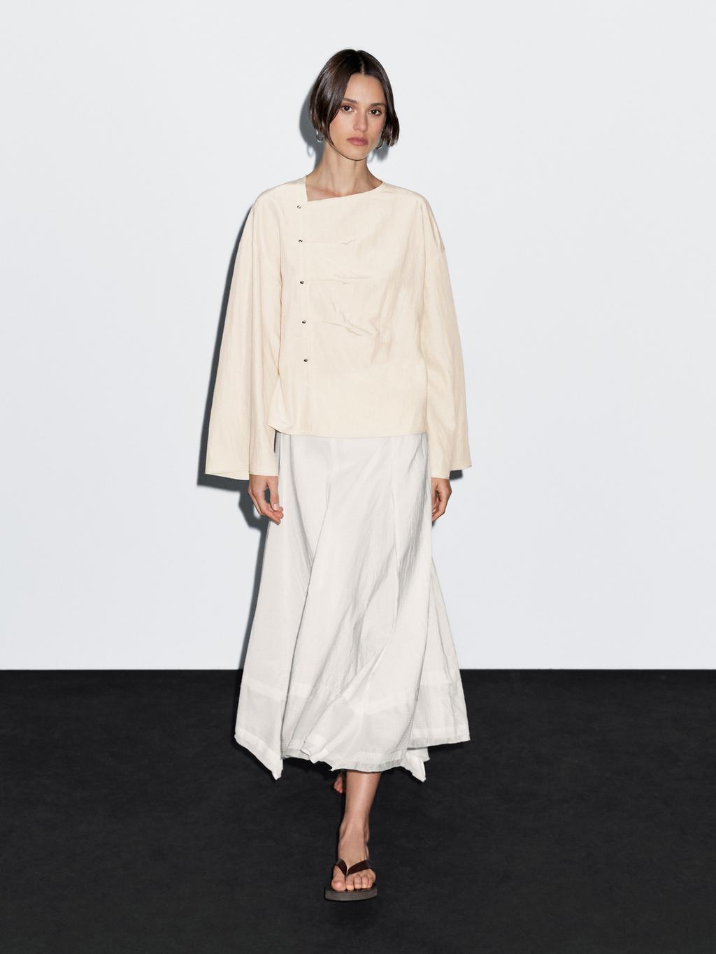 Flowing blouse. Crew neck. Wide long sleeve. Elegant silver-toned rhinestone buttons. Button fastening at the side.