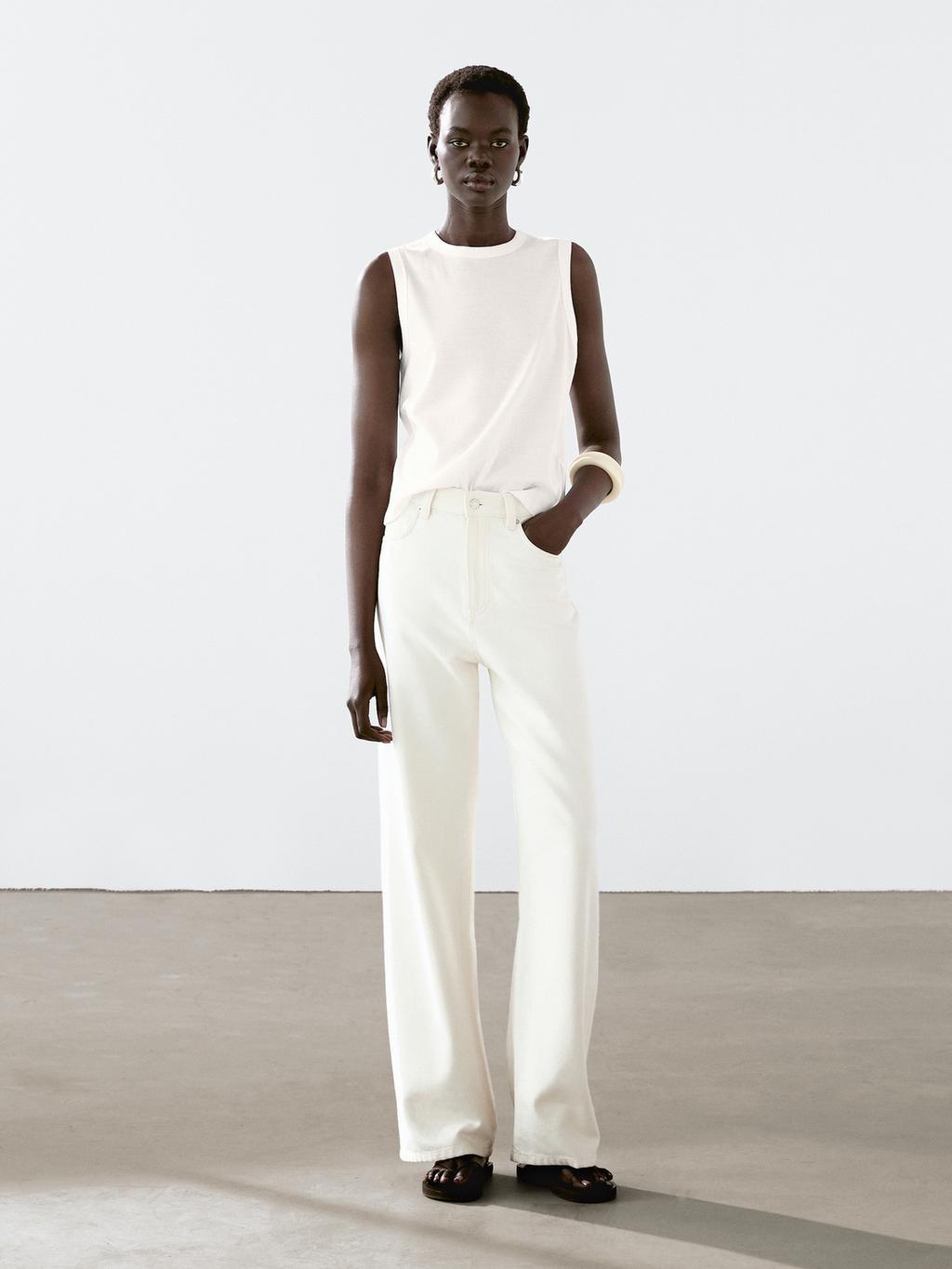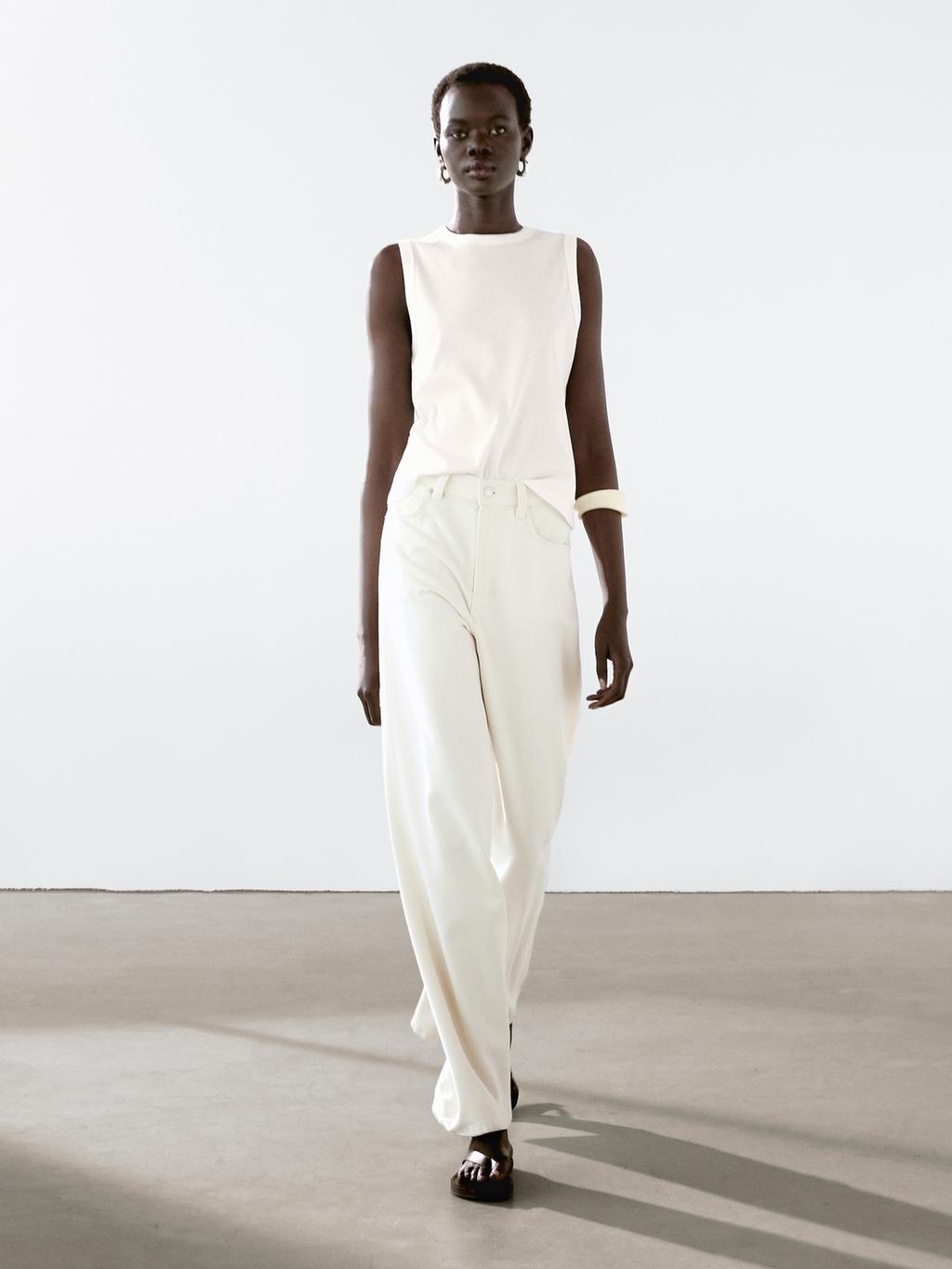 T-shirt made of 100% cotton. Boxy Fit: this fit has a square & loose-fitting shape, with a straight drape from the shoulders to the hem. Crew neck. Thick straps.