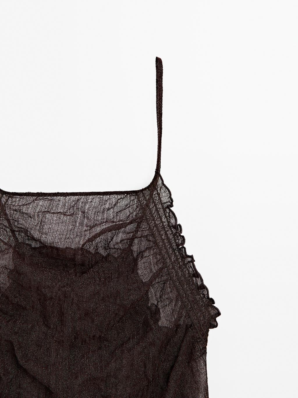 Halter neck top . Strappy. Open back detail. Wrinkled effect finish. Semi-sheer fabric.