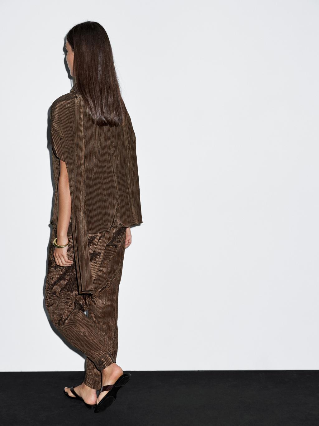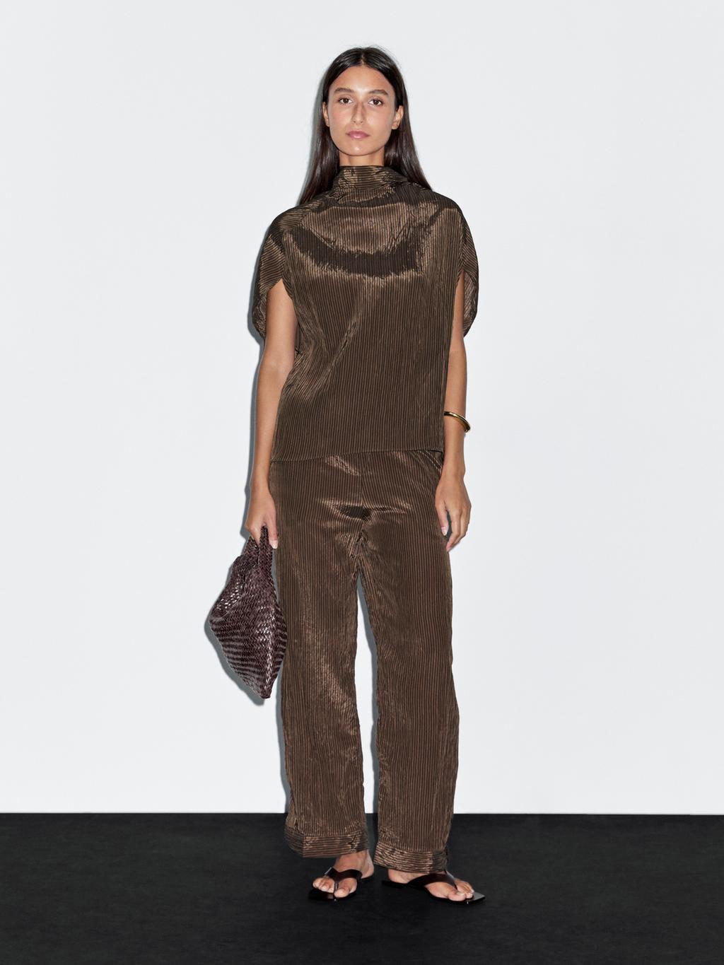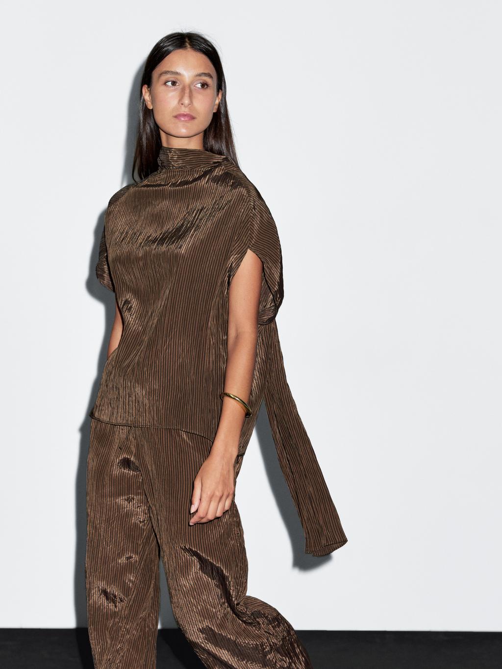 Sleeveless sleeveless blouse with dropped armhole. Back button fastening and teardrop opening. Collar with multiway shawl-style tie detail. Striped detail. Matching garment available.