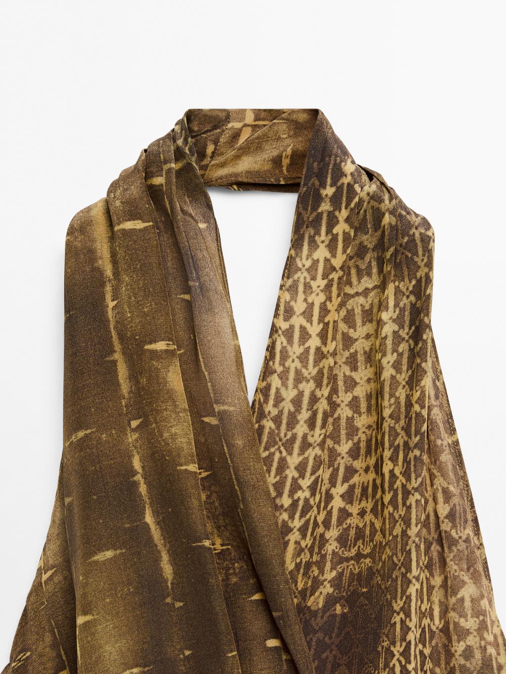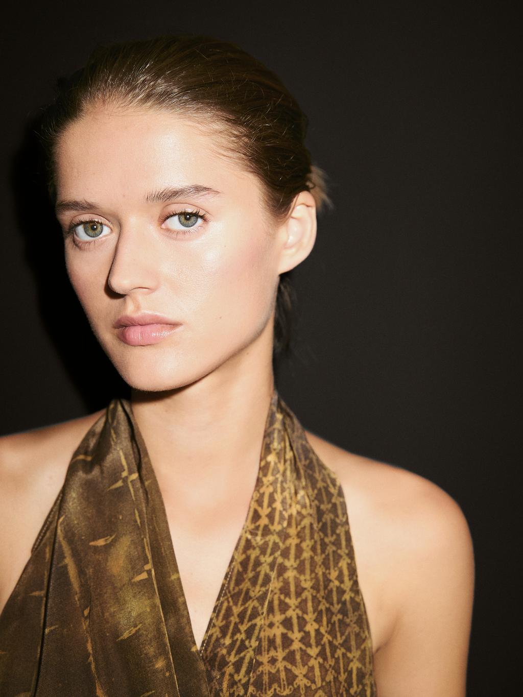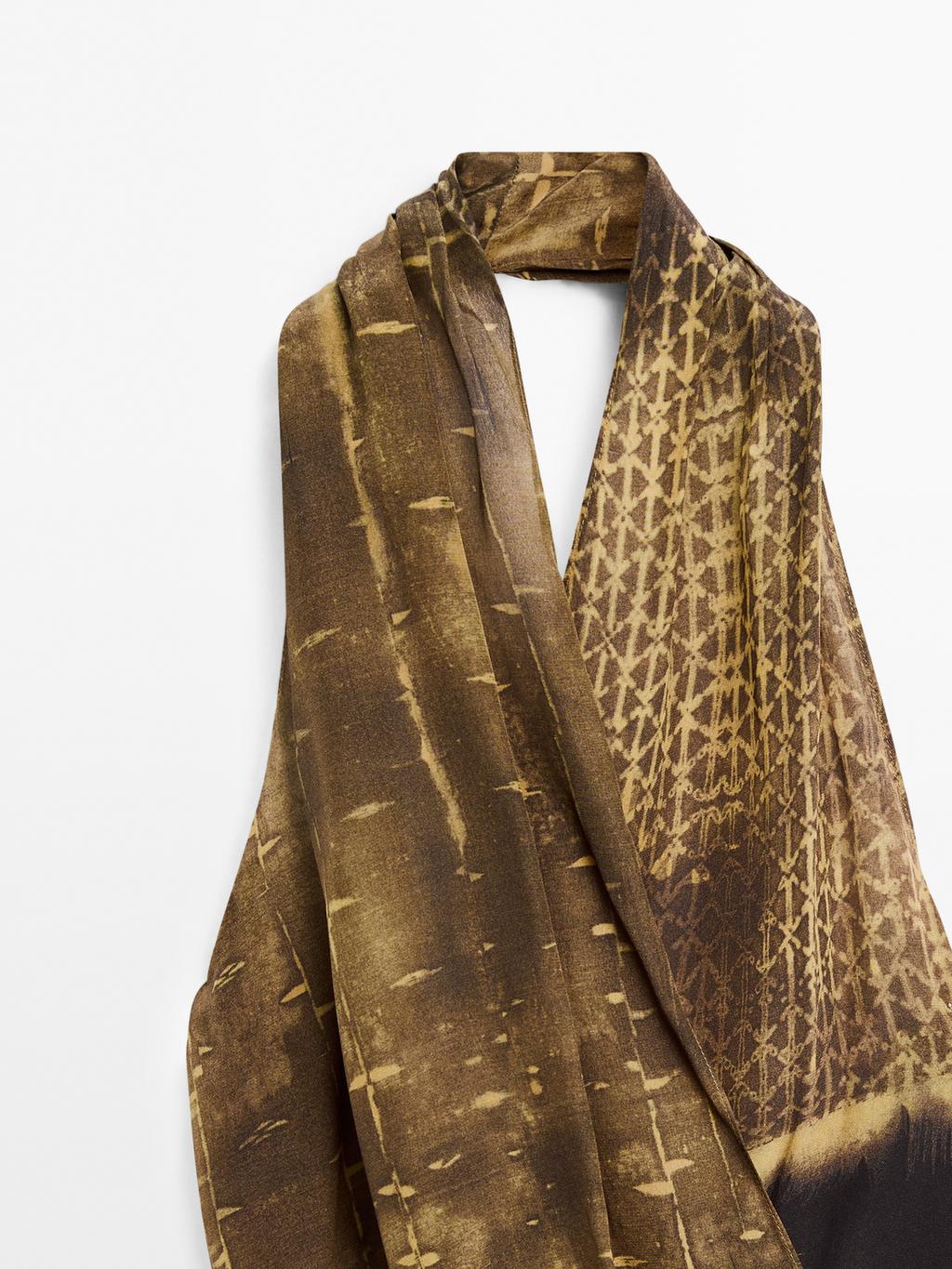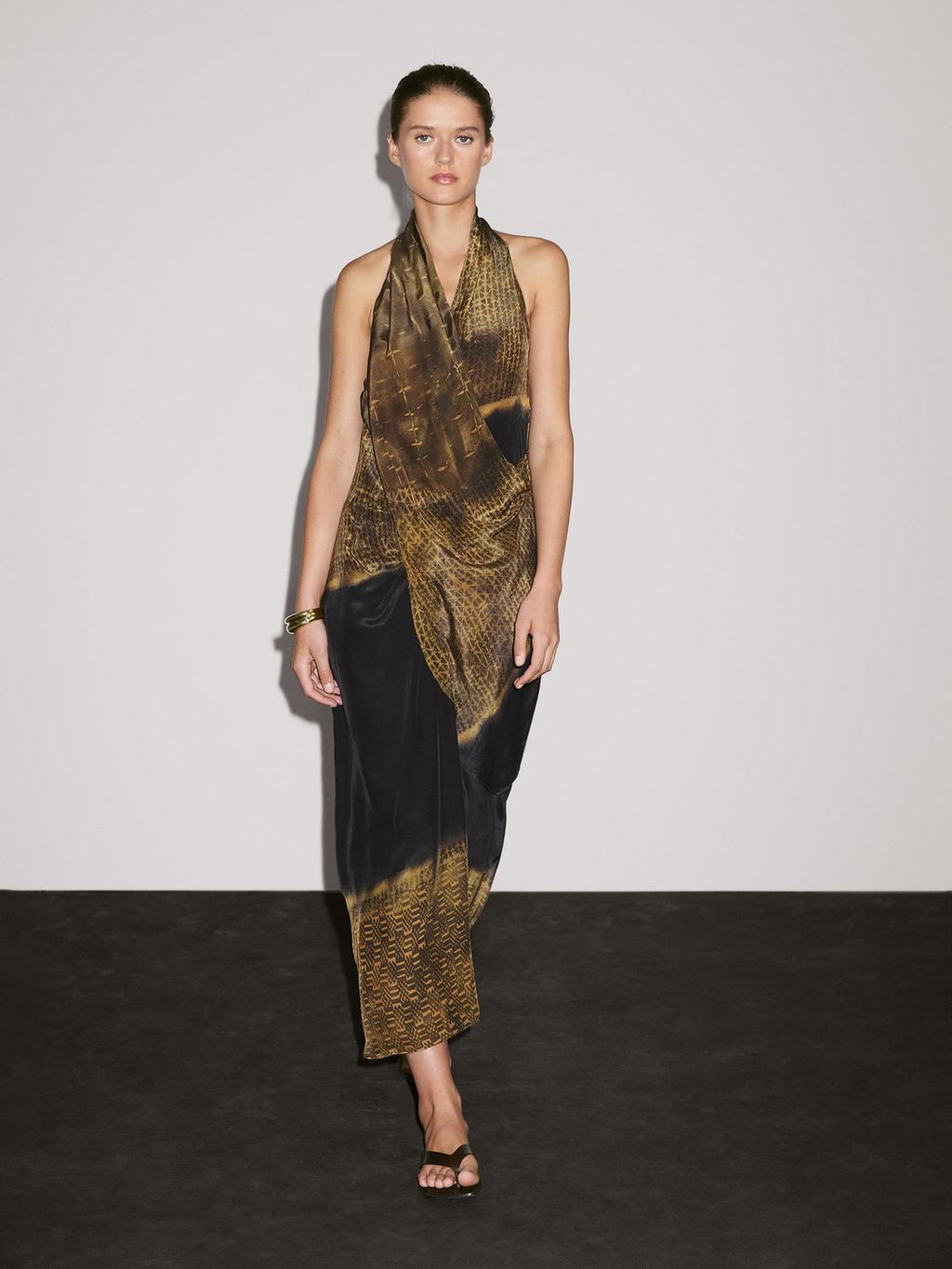 Flowing midi dress with draped halter neckline. Neckline detail at the back . Sleeveless. Side zip fastening. Lined. Flowing fabric.