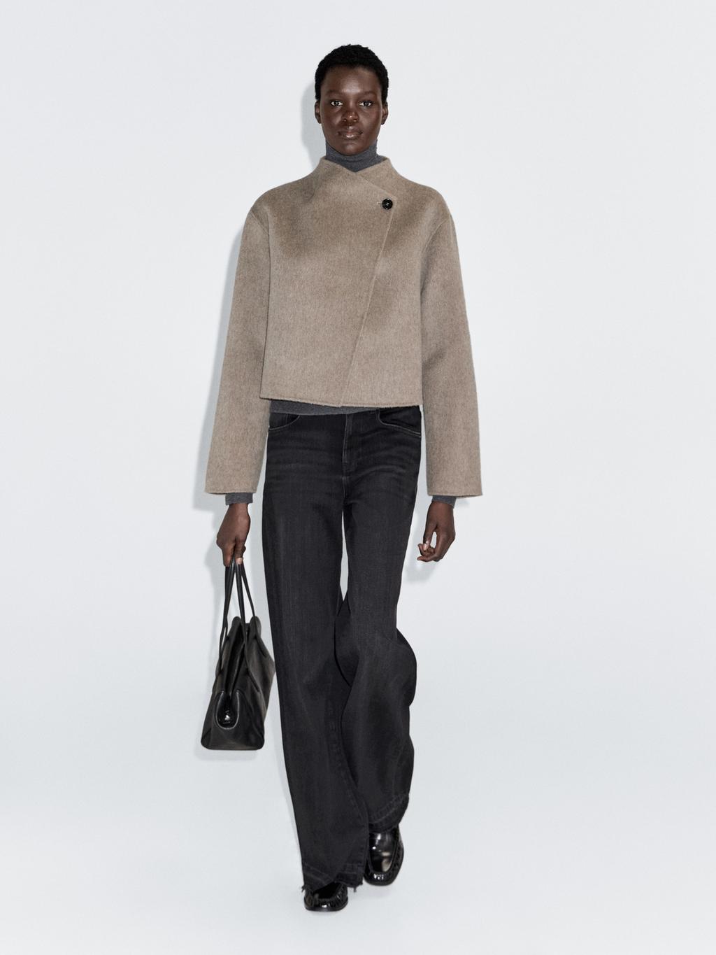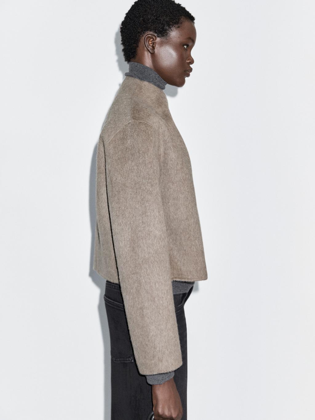 Short coat made of woollen blend fabric. Long sleeves. Double-breasted button fastening at the front. High collar. Brushed finish.