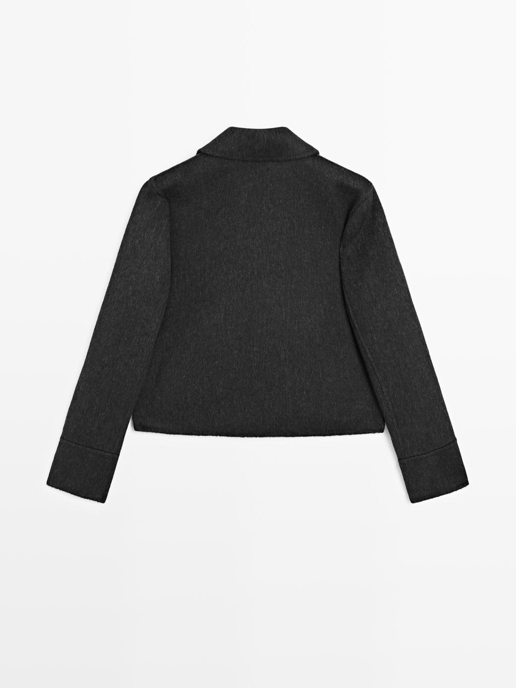 Short coat made of wool blend fabric . Shirt collar. Long sleeves. Double-breasted button fastening at the front. Two side pockets. Detail finished in fuzzy fabric. Matching garment available.