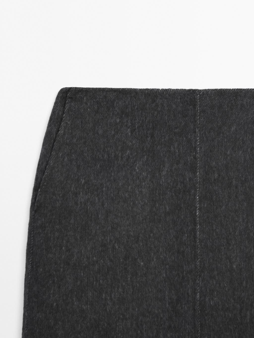 Short skirt made of a wool blend. Zip fastening at the back. Detail finished in fuzzy fabric. Seam details .
