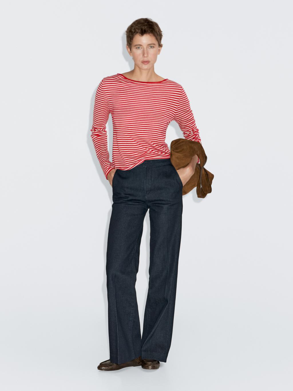 Wool blend knit sweater. Boat neck. Round neck. Long sleeves. Striped detail. Soft fabric that's pleasant to the touch .