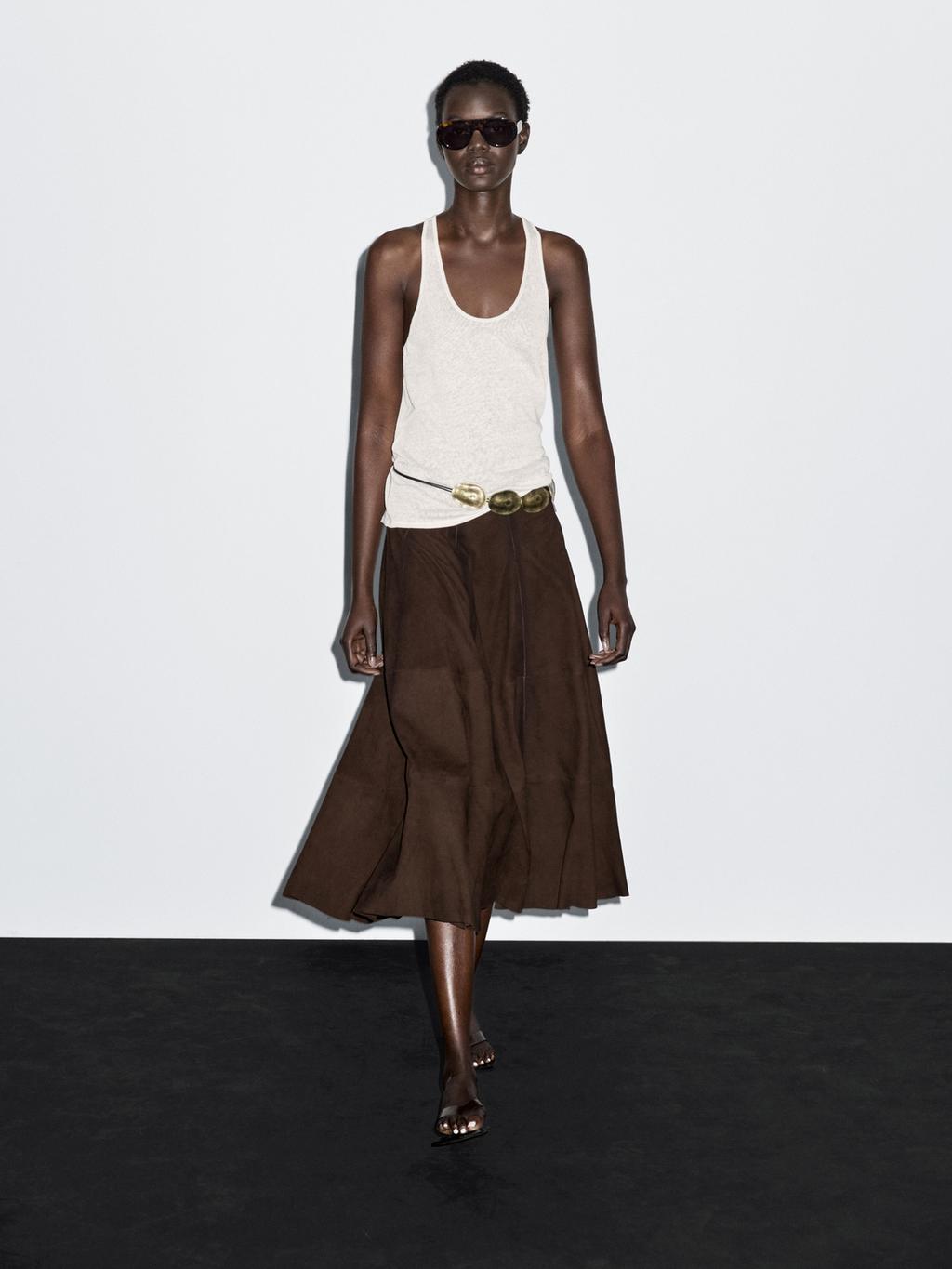 Short skirt made of goatskin with a suede finish . Side zip fastening. Lined. Seam details .