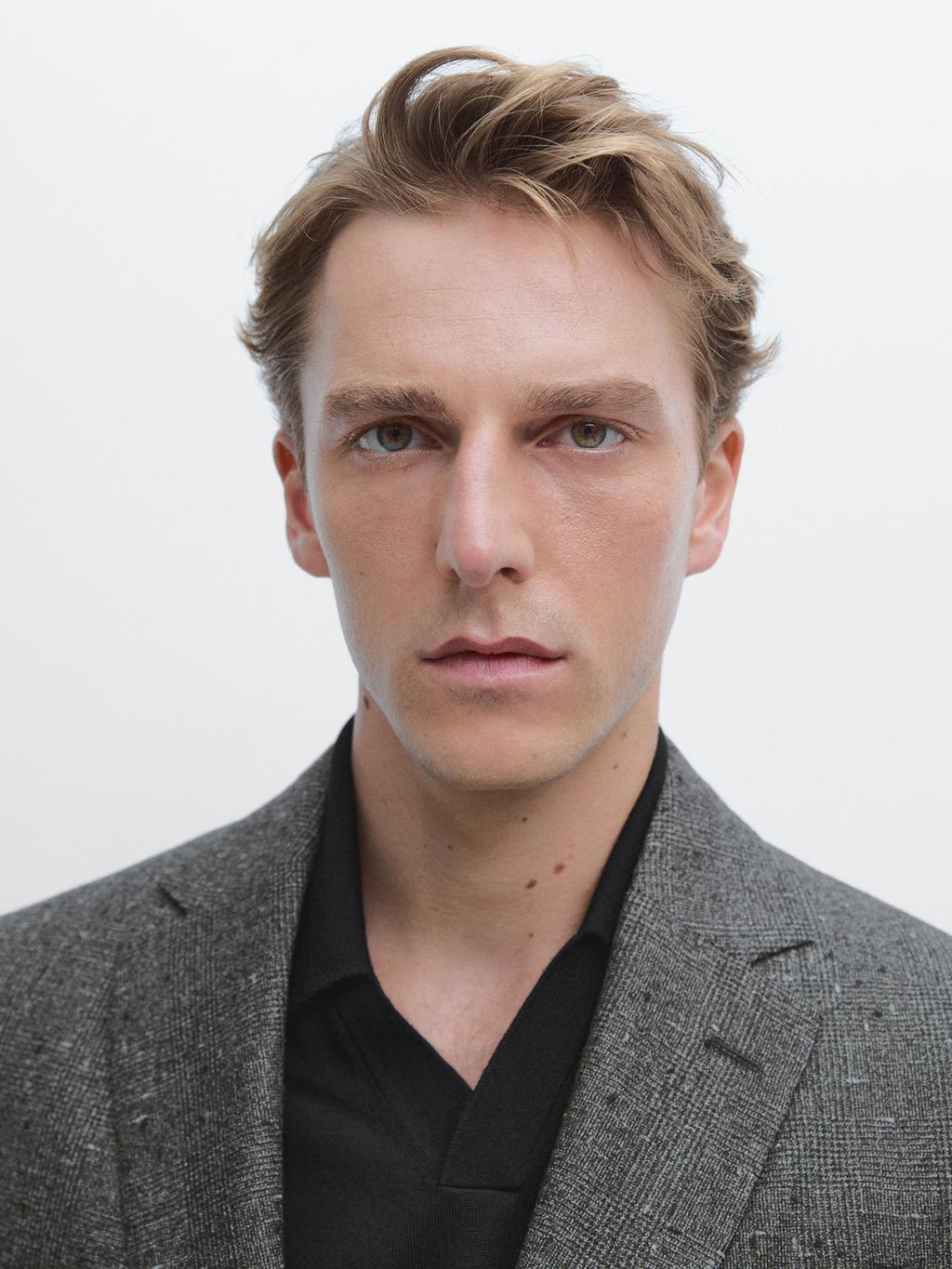 Wool blend blazer. Notched lapel collar with buttonhole. Long sleeves with buttoned cuffs. Two-button fastening. patch pockets. Inside pockets. Side vents at the hem.
