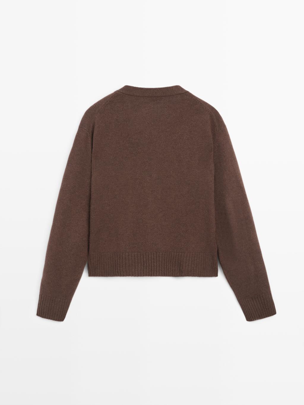 Wool blend knitted cardigan. V-neck. Button-up front. Elegant gold-toned rhinestone buttons. Two buttoned flap pockets . Ribbed trims .
