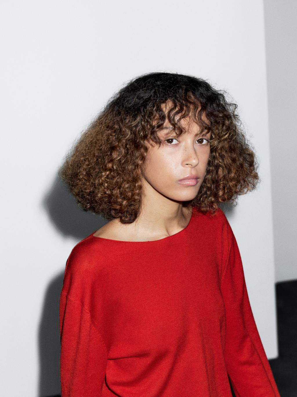 Wool blend knit sweater. Boat neck. Long sleeves.