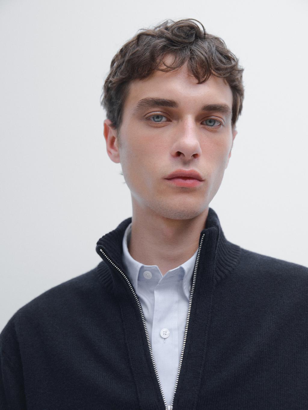 Wool blend knitted cardigan. Long sleeves. It has a two-way zip fastening. High collar. Two side pockets. Ribbed trims .