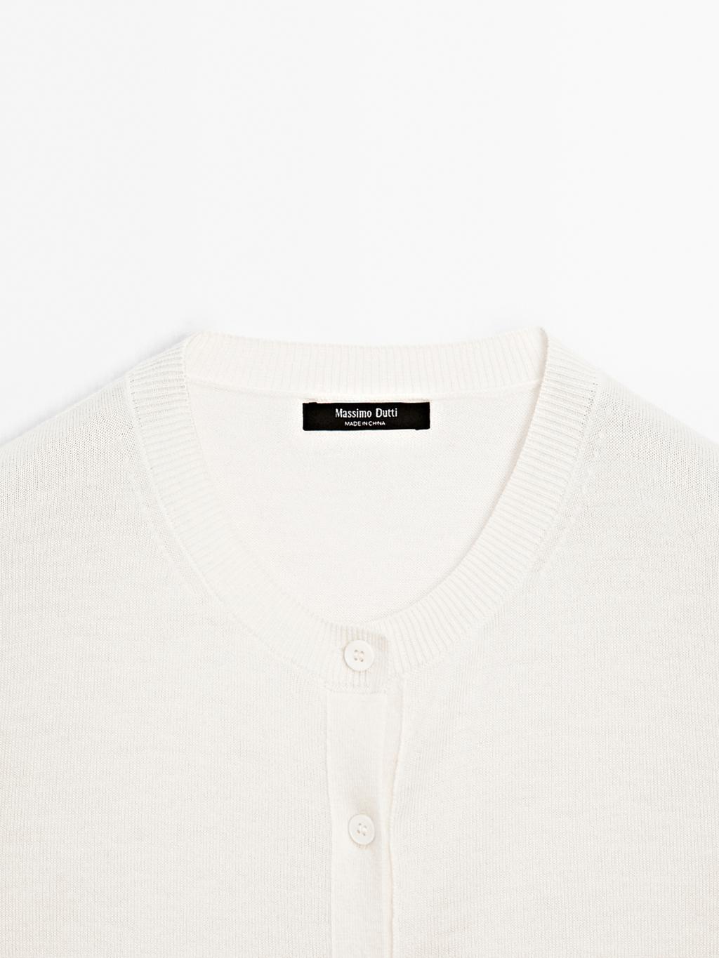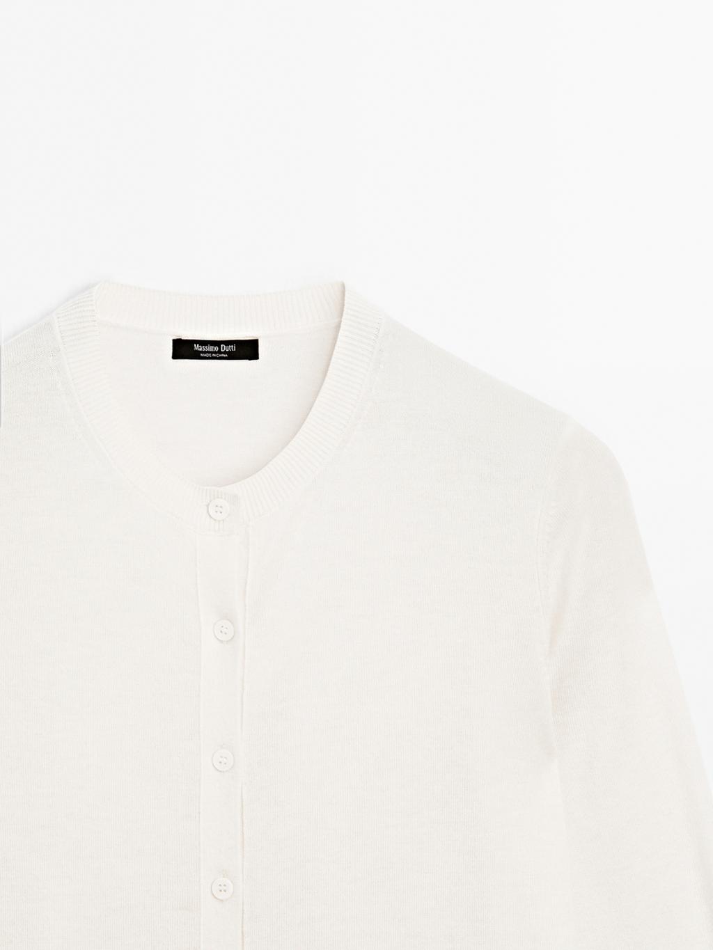 Cardigan made of knit fabric with wool . Crew neck. Long sleeves. Button-up front.