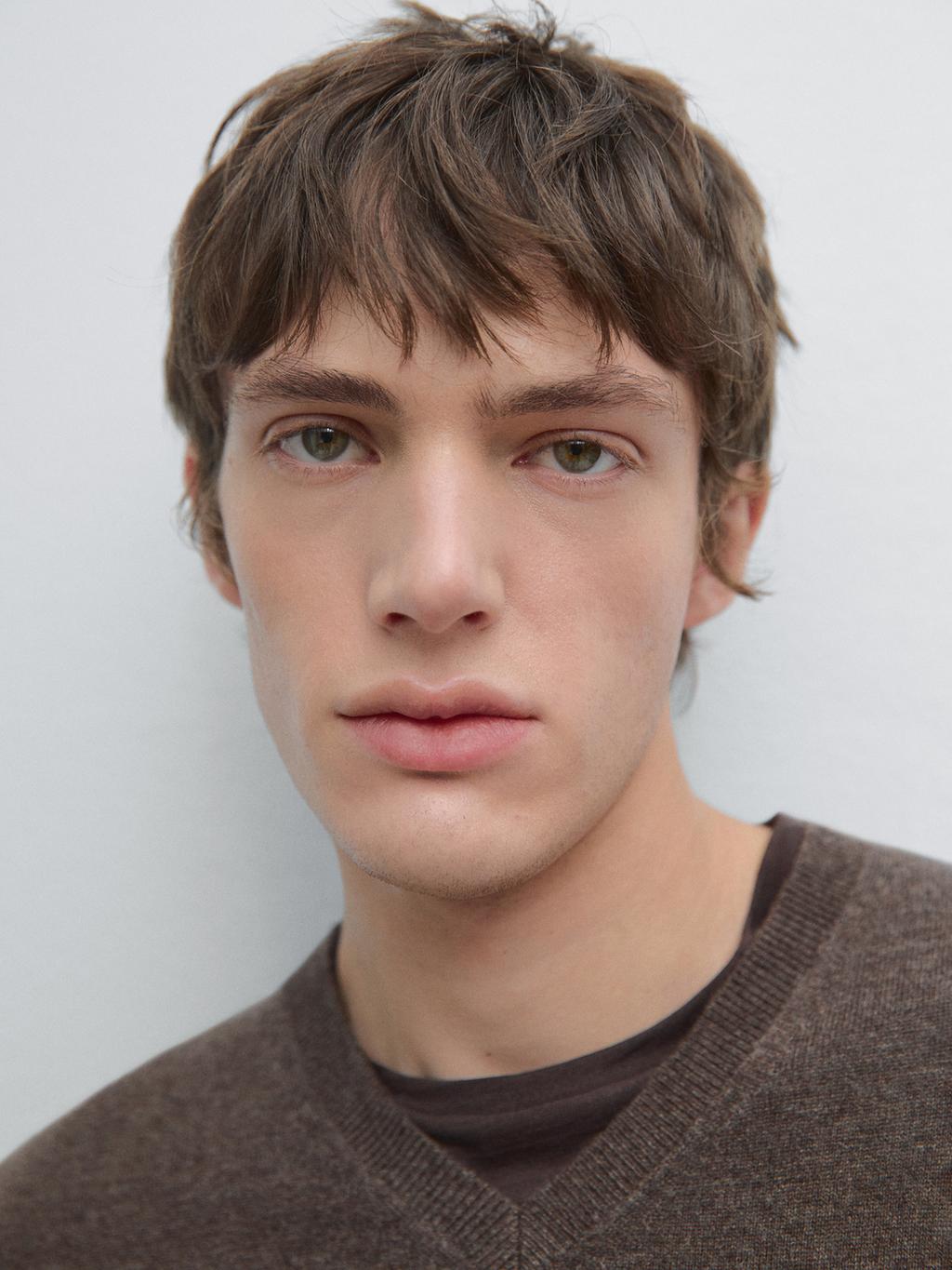 Knit sweater in wool blend fabric. V-neck. Long sleeves. Ribbed trims .